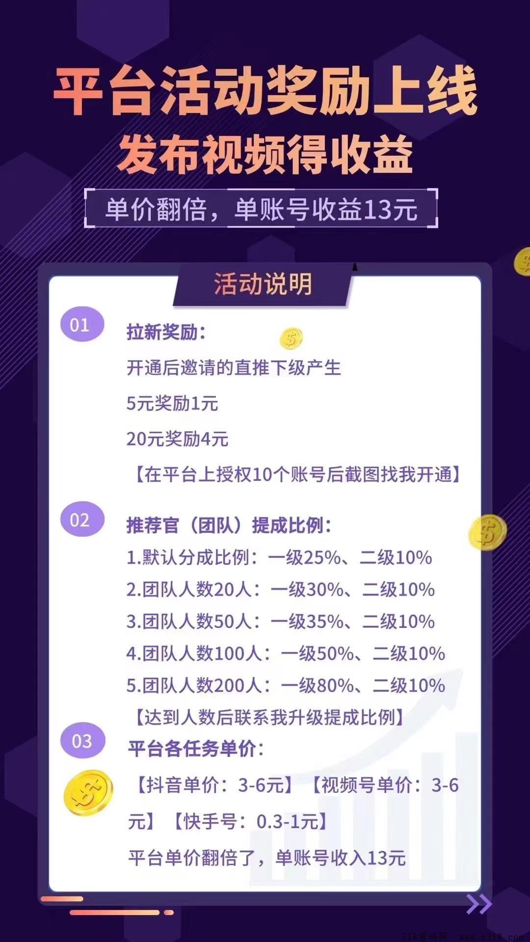 让你的闲置小号轻松给您赚钱,平台上对个活动奖励,团队提成最高到80%