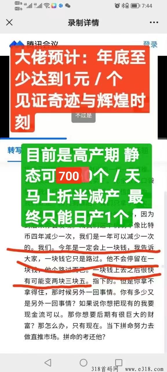 目前一天**可产700左右个数字资产 动态无限 大佬们预测年底將达达到1元/个 很快折半减产 逐渐减产到只能日产1个