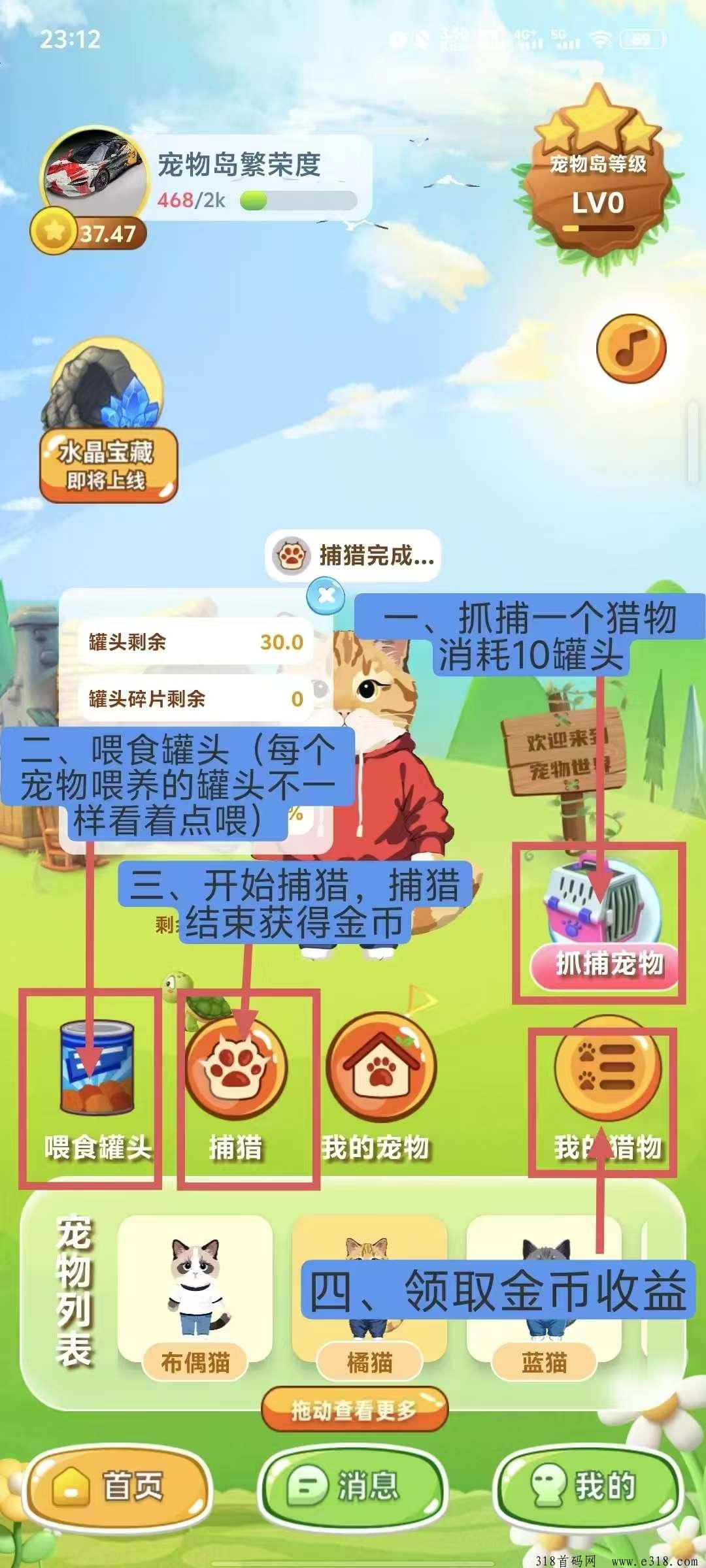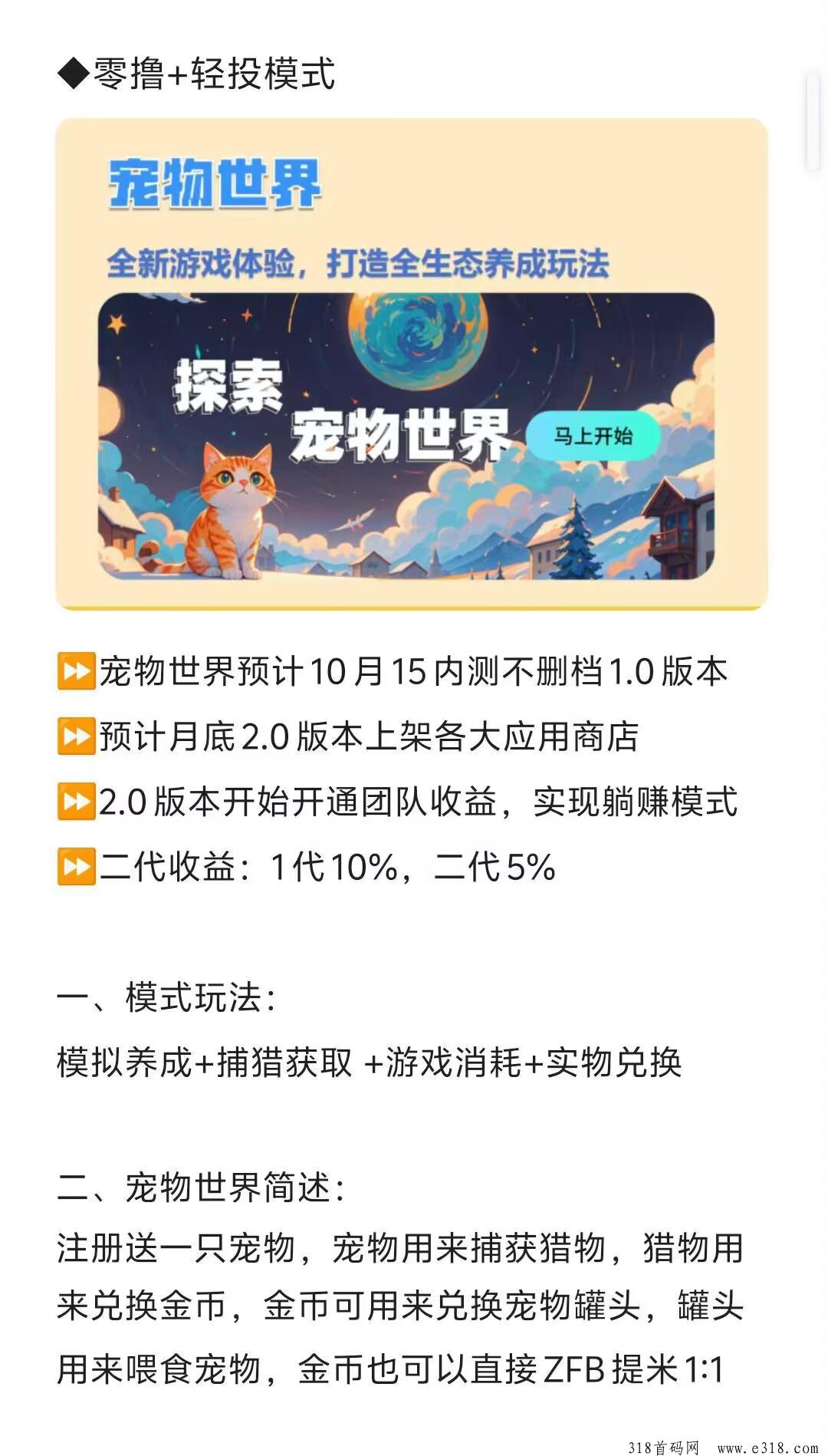 宠物世界首码,零撸每天5个广告,捕猎鲁金必,1金币一米,0.3起提致富宝,模式玩法:模拟养成+捕猎获取+游戏消耗+实物兑换