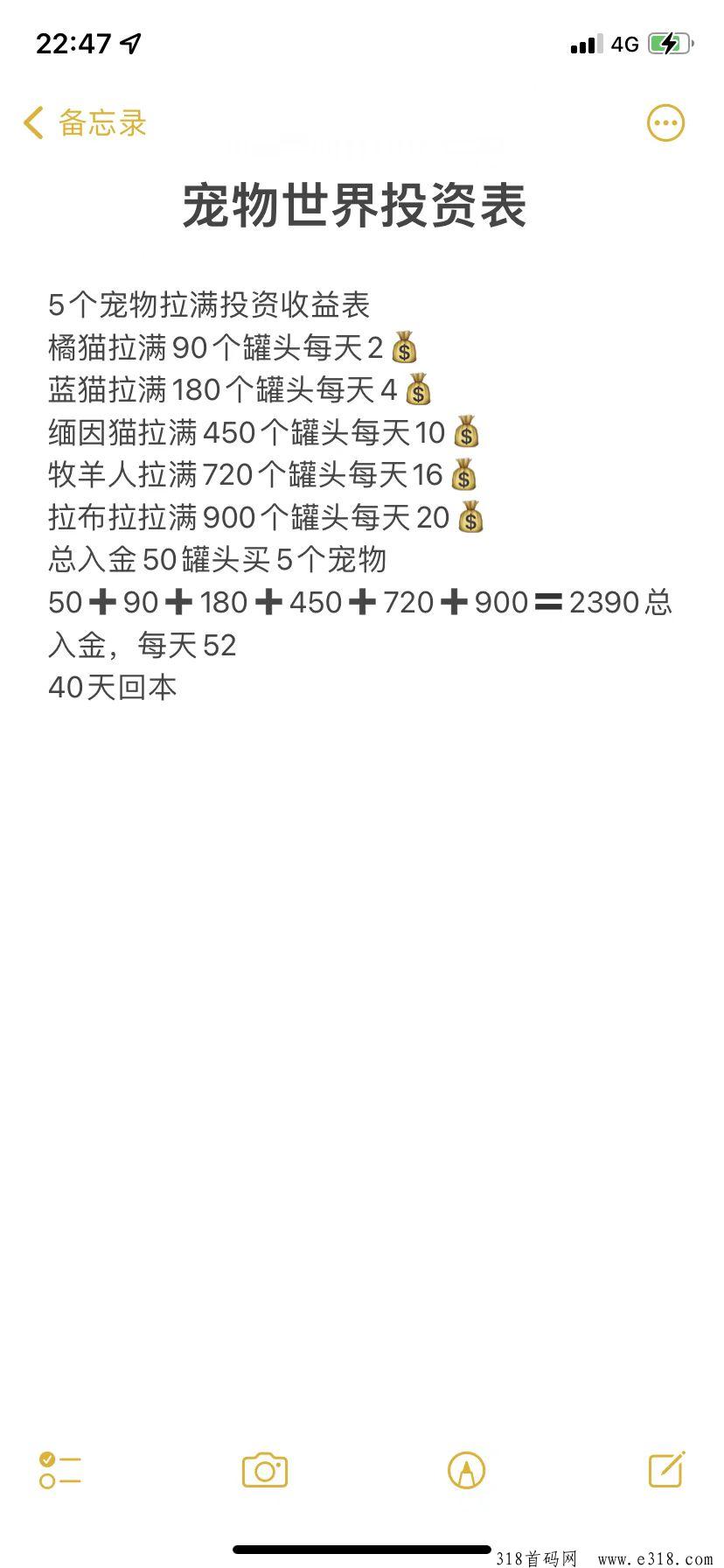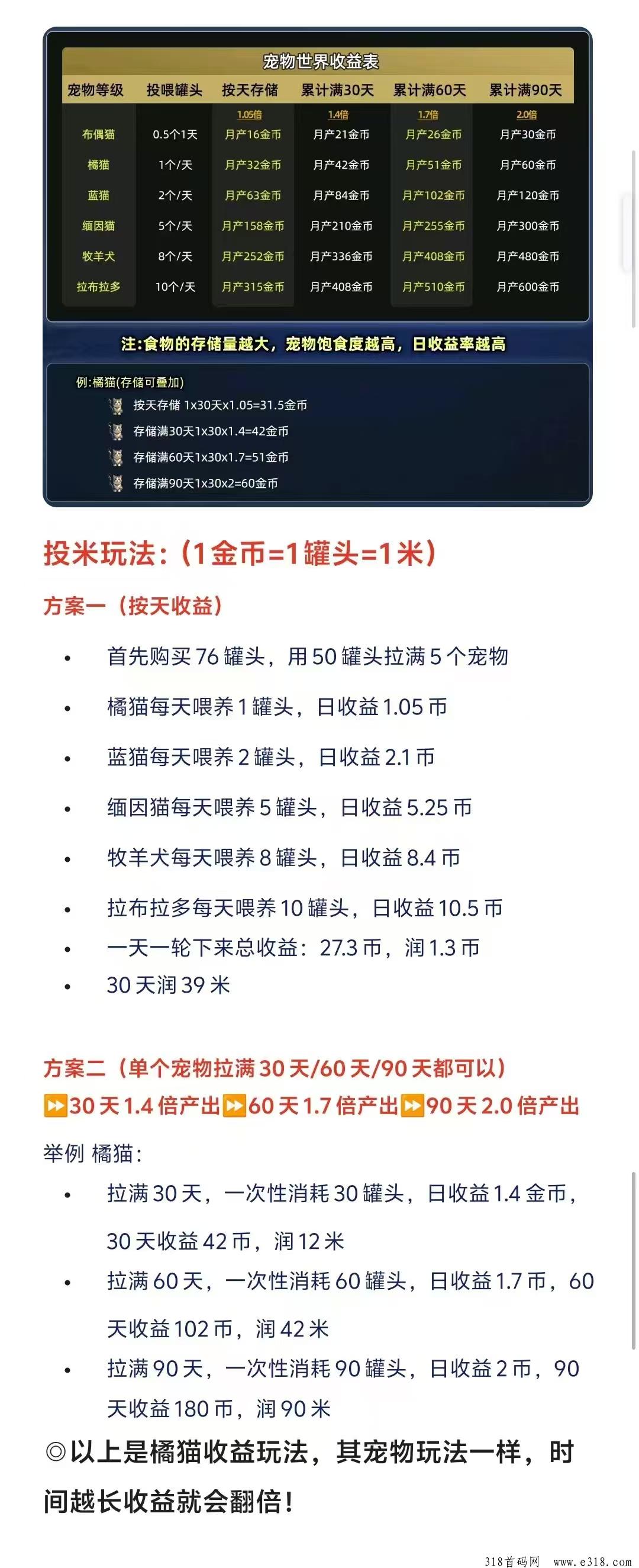 注册送一只宠物,宠物用来捕获猎物,猎物用来兑换金币,金币可用来兑换宠物罐头,罐头用来喂食宠物,金币也可以直接ZFB提米1:1