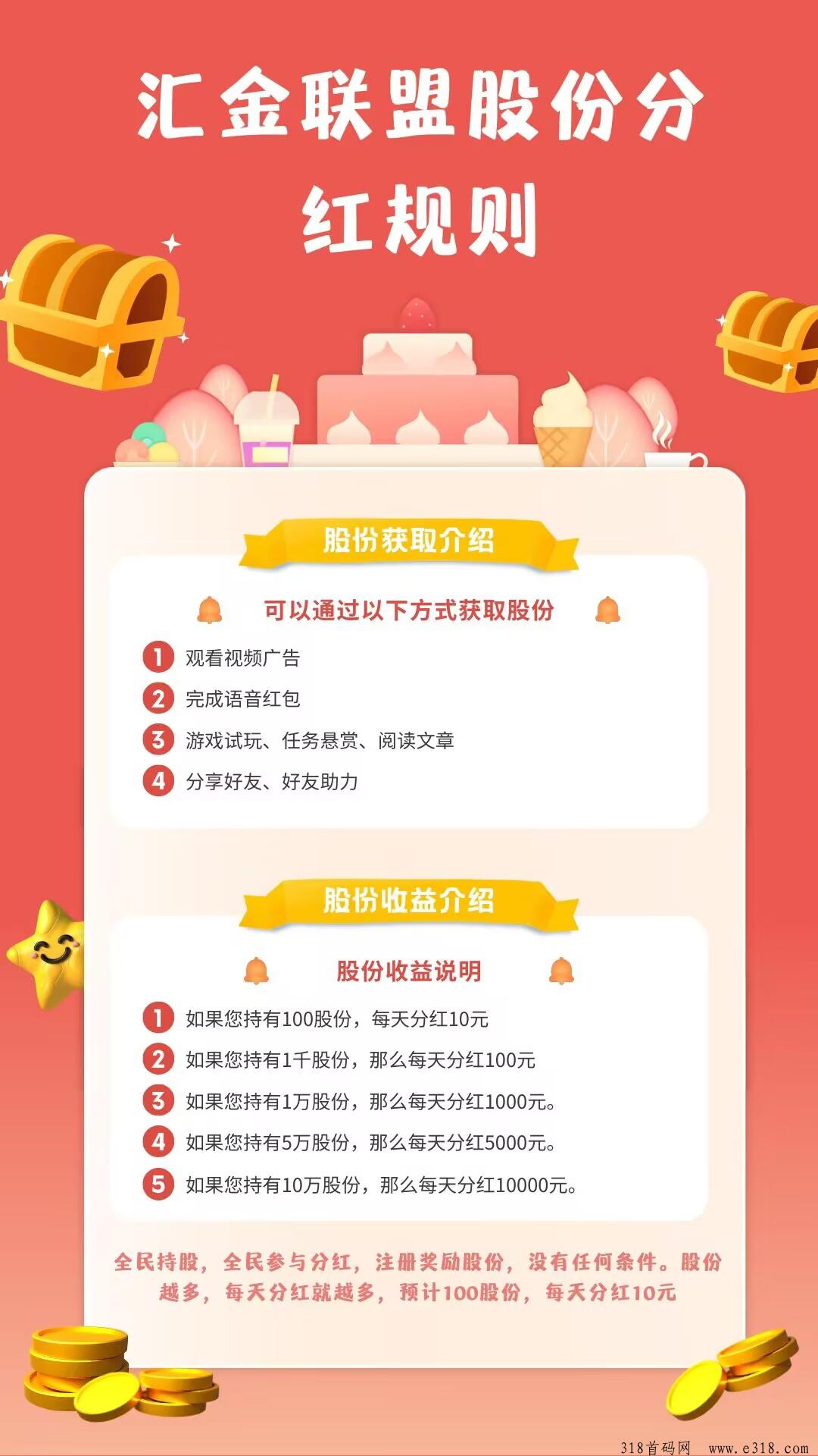 汇金联盟首码,注册就送古份,无需开会员、认证就可以芬宏和提现。古份越多,每天芬宏就越多。预计100古份,每天**10元