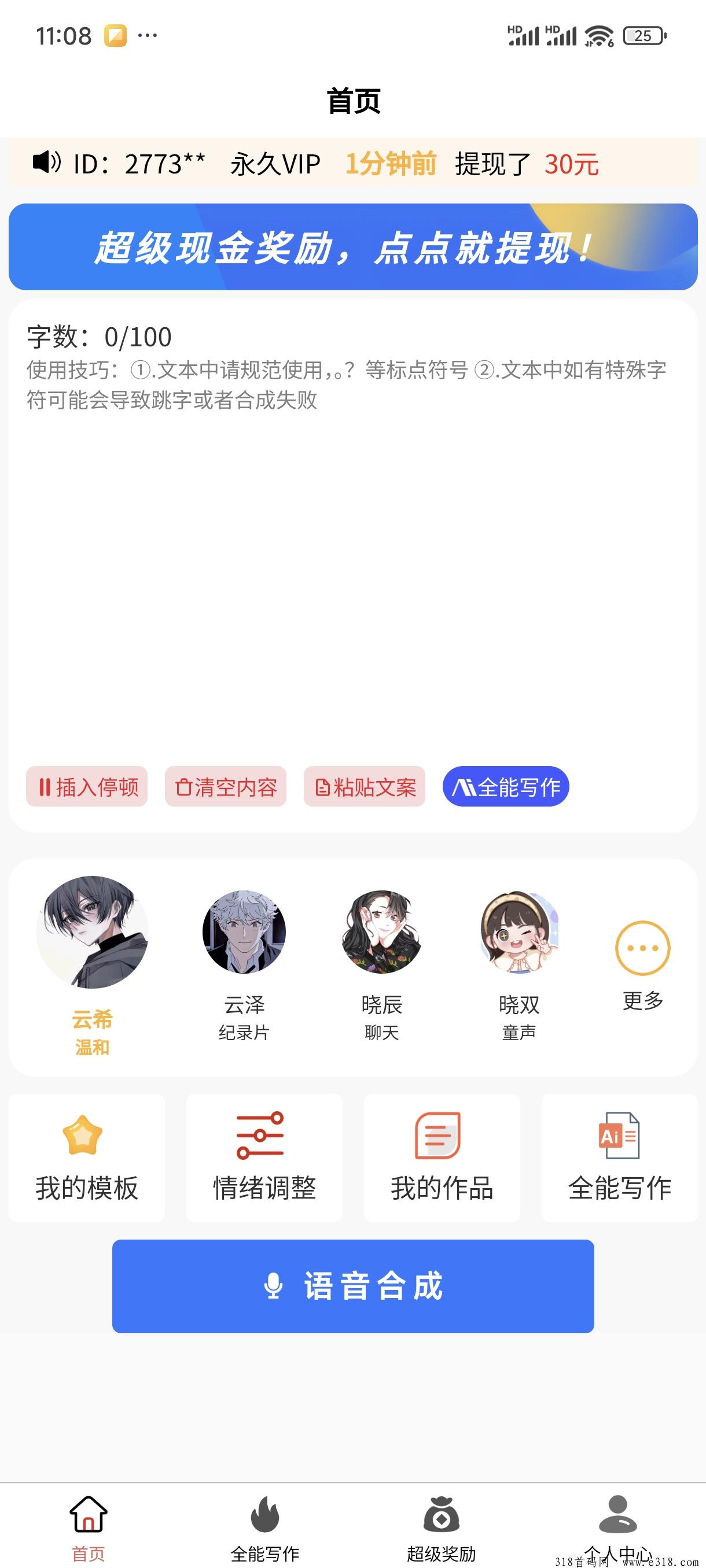 尚配音邀请码378393尚配音邀请码378393输入有奖励的大家安装软件打开之后只需要将文本内容复制进转换框中即可,点击就能自动配音,多种不同的音色供你选择,配好之后可以导出到本地保存,而且随时都能进行修改、剪裁、变声、拼接等操作,功能很丰富。