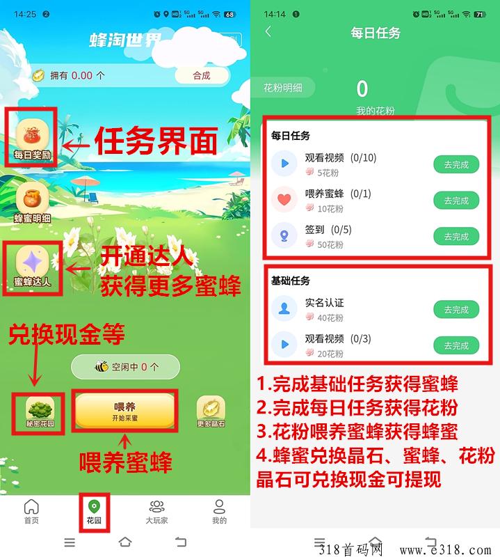 二、完成每日任务→获得花粉→30花粉喂养蜜蜂→倒计时结束后自动收获蜂蜜