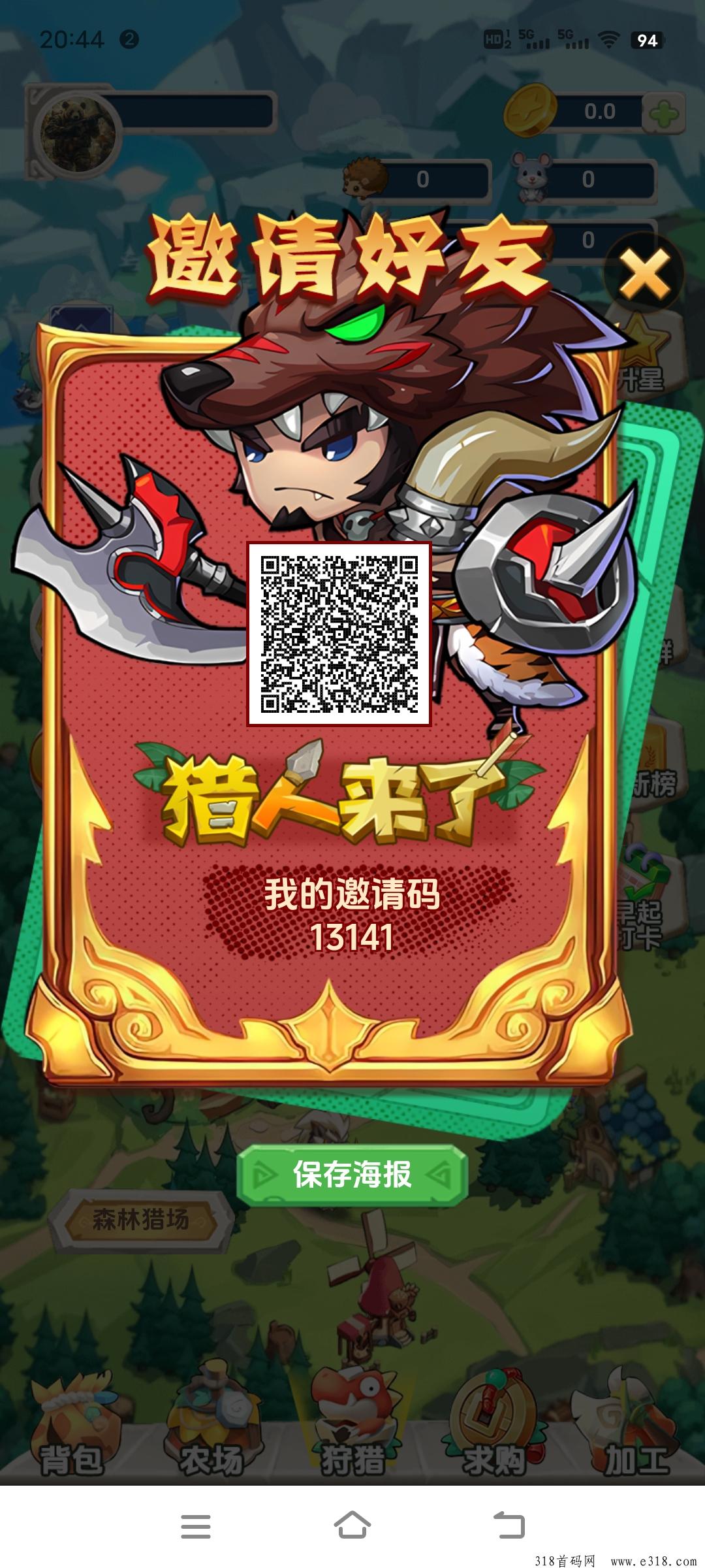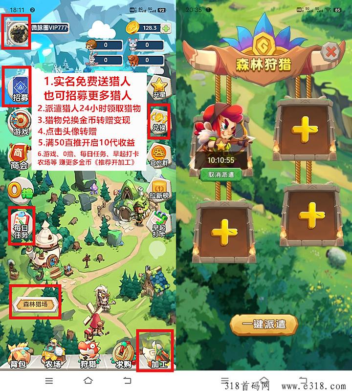二、森林猎场派遣猎人,24小时回收领取猎物,兑换成金币