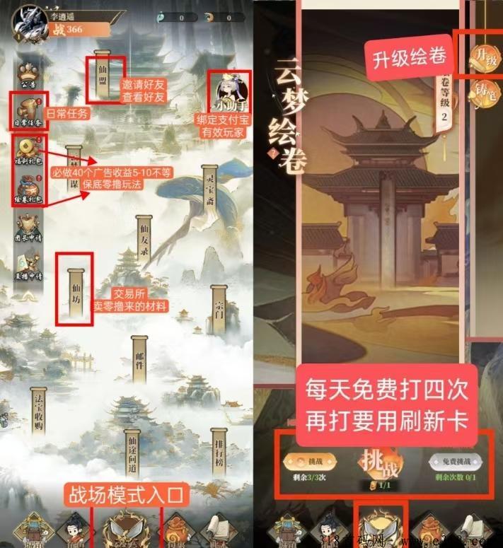 玩法:每日在福利礼包+绘卷礼包看40个广告获得经验丹和装备等材料,角色修炼升级,满20级后看广告可得灵玉,绘券每日4次免费挑战获得各种材料。