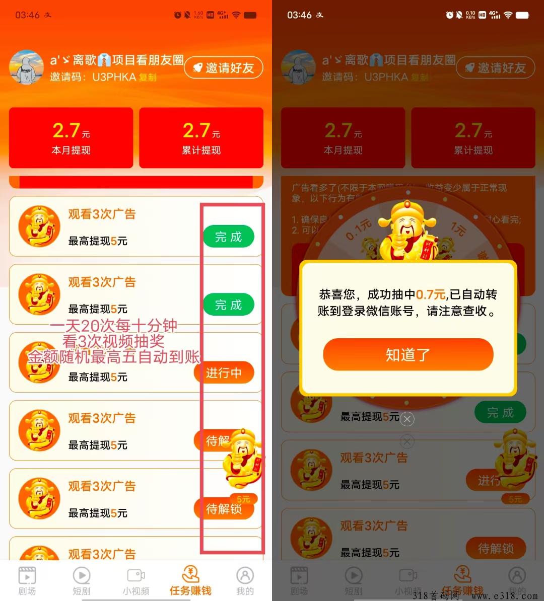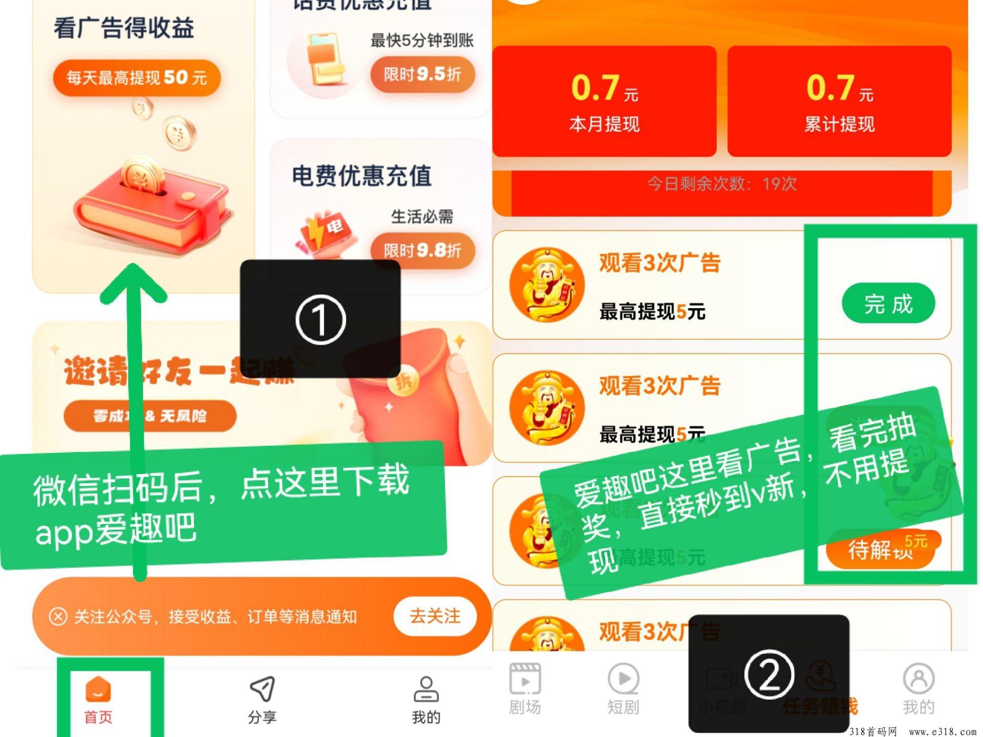 爱趣吧新不养鸡广告赚,两三分钟看6个视频,就挣3米。根本不用你提,每看3个视频就有米,自动秒到微信,每天最多看30个视频最多挣50米。