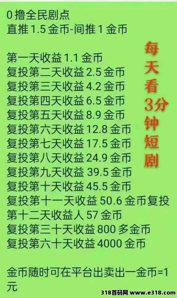 全民剧点每天看三分钟短剧不用复投产出即买,每月零撸400+