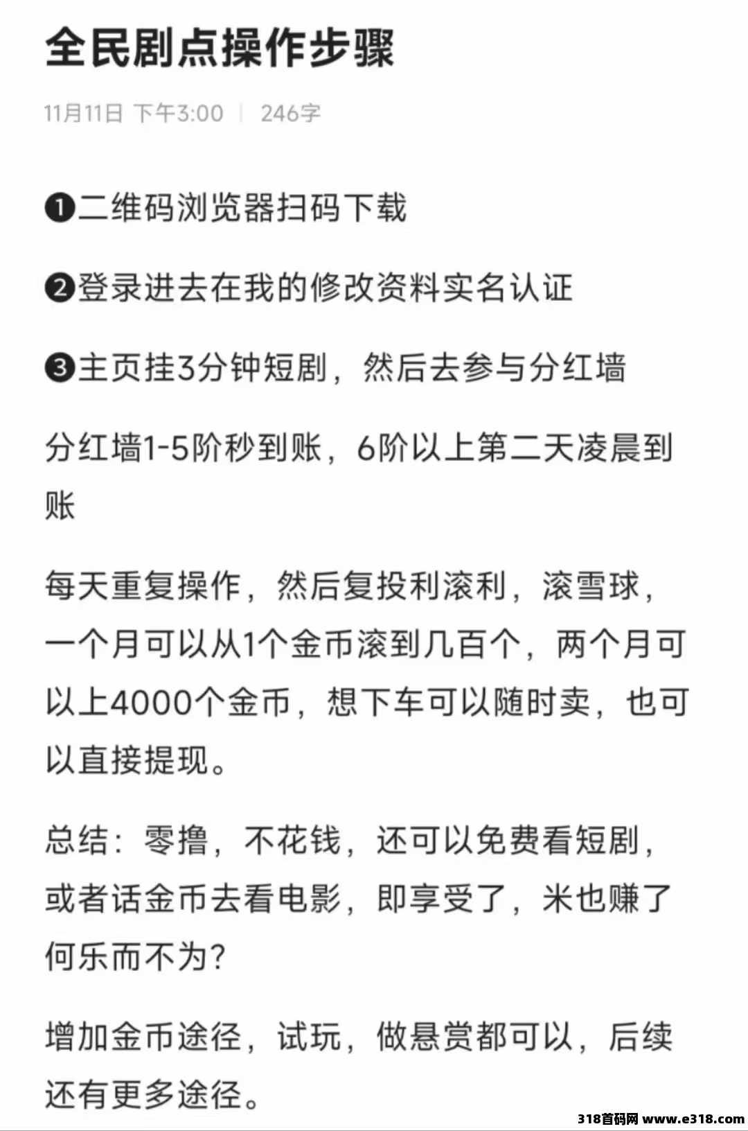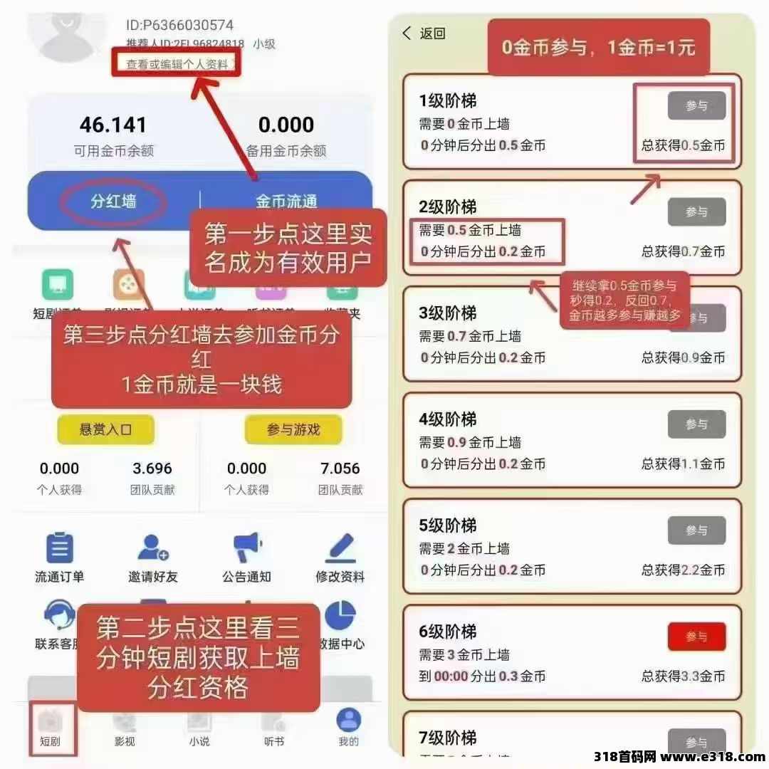 玩法介绍:每天看短剧3分钟就奖励分,拿着分去上墙做悬赏任务赚更多的分,每天上墙翻倍复利!