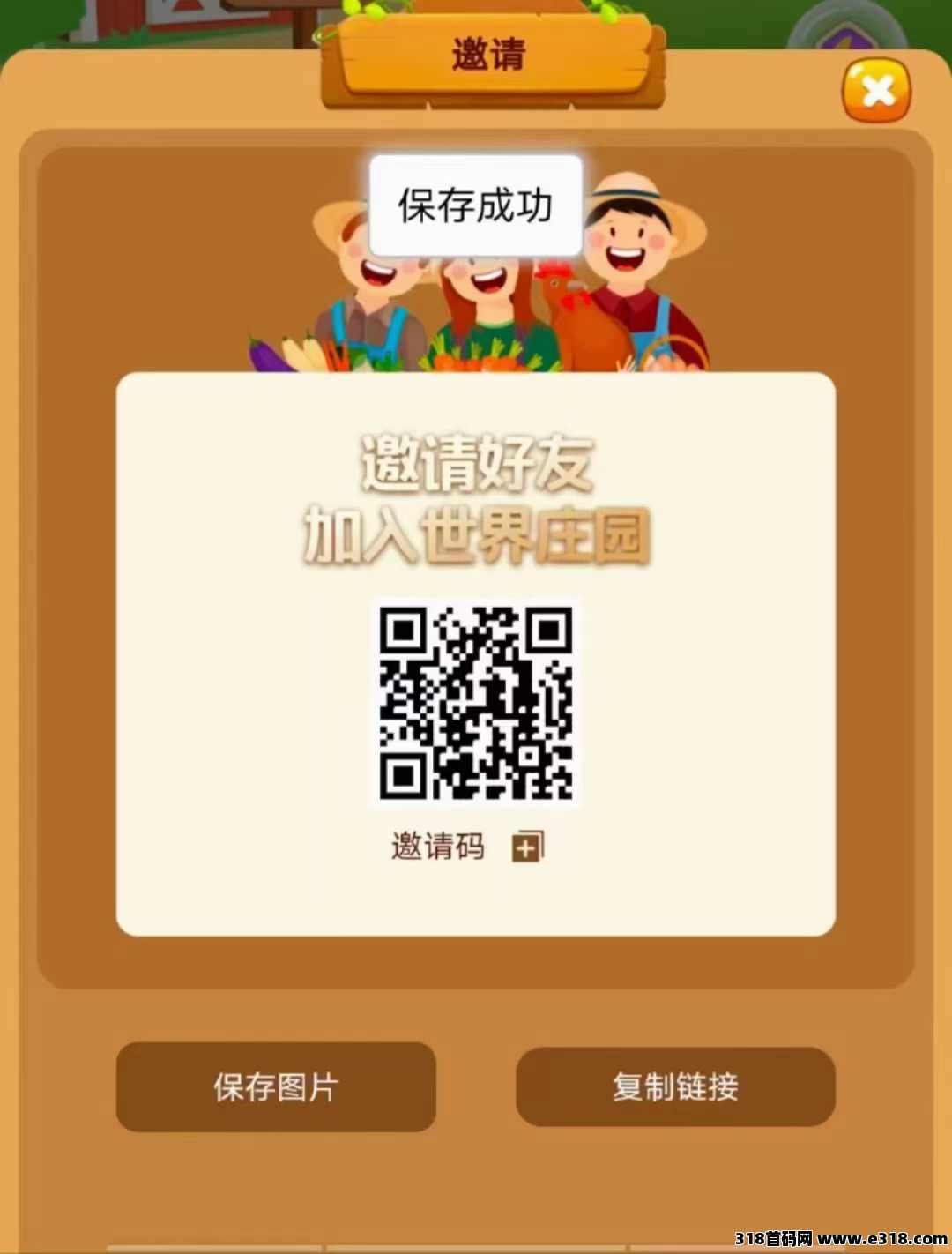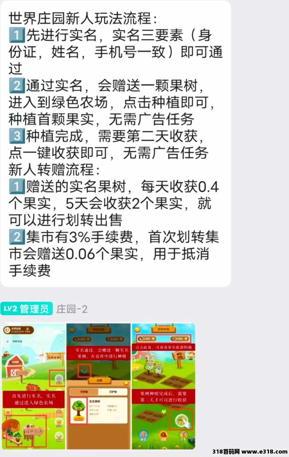 ——世界庄园首码,刚出一秒,模拟农场经营无广告。注册后下载实名,赠送任务包,果树种植!记得第二天领取,新人种植5天再送一个体验包。卖出规则:余10,玩5天可试卖一个。