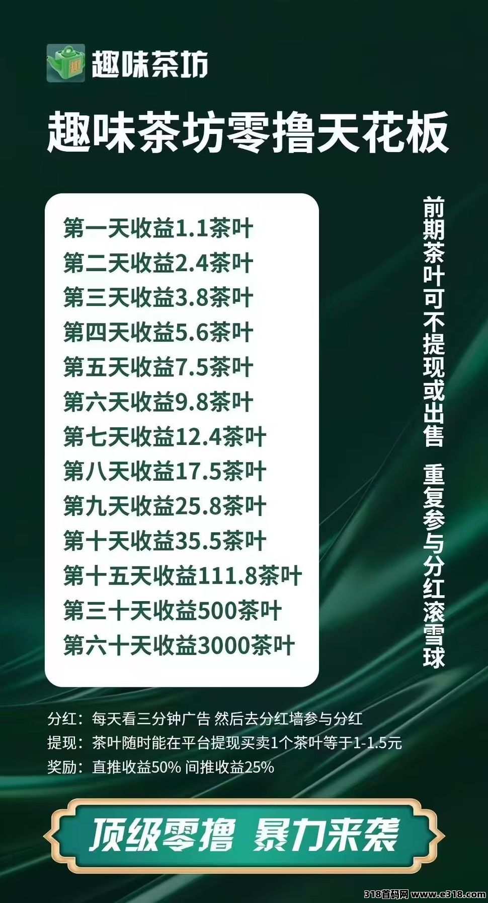 趣味茶坊是一个0撸项目,用户可以通过简単的操作实现轻松赚取收溢。每天只需花费3分钟观看广告,就可以获得茶叶,这些茶叶不仅可以出售,还可以提取或兑换其他商品。更重要的是,平台提供了实物支撑和广告补贴,使得用户能够享受到稳定的收溢。