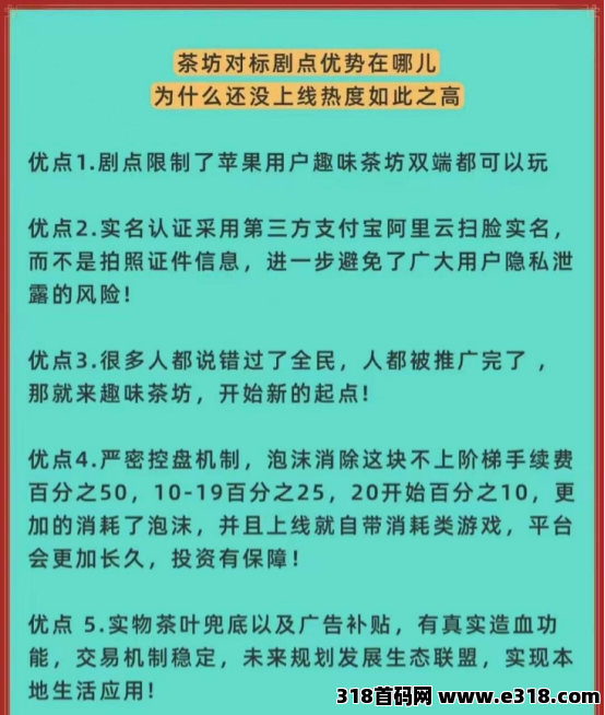 【茶趣新平台】今日安卓与苹果双平台同步首发,推出改良版全民参与模式,融入消耗性小游戏,确保平台更加稳健持久。更有实物茶叶作为保障,外加广告补贴福利。错过之前的机会,别再错过茶趣新平台!