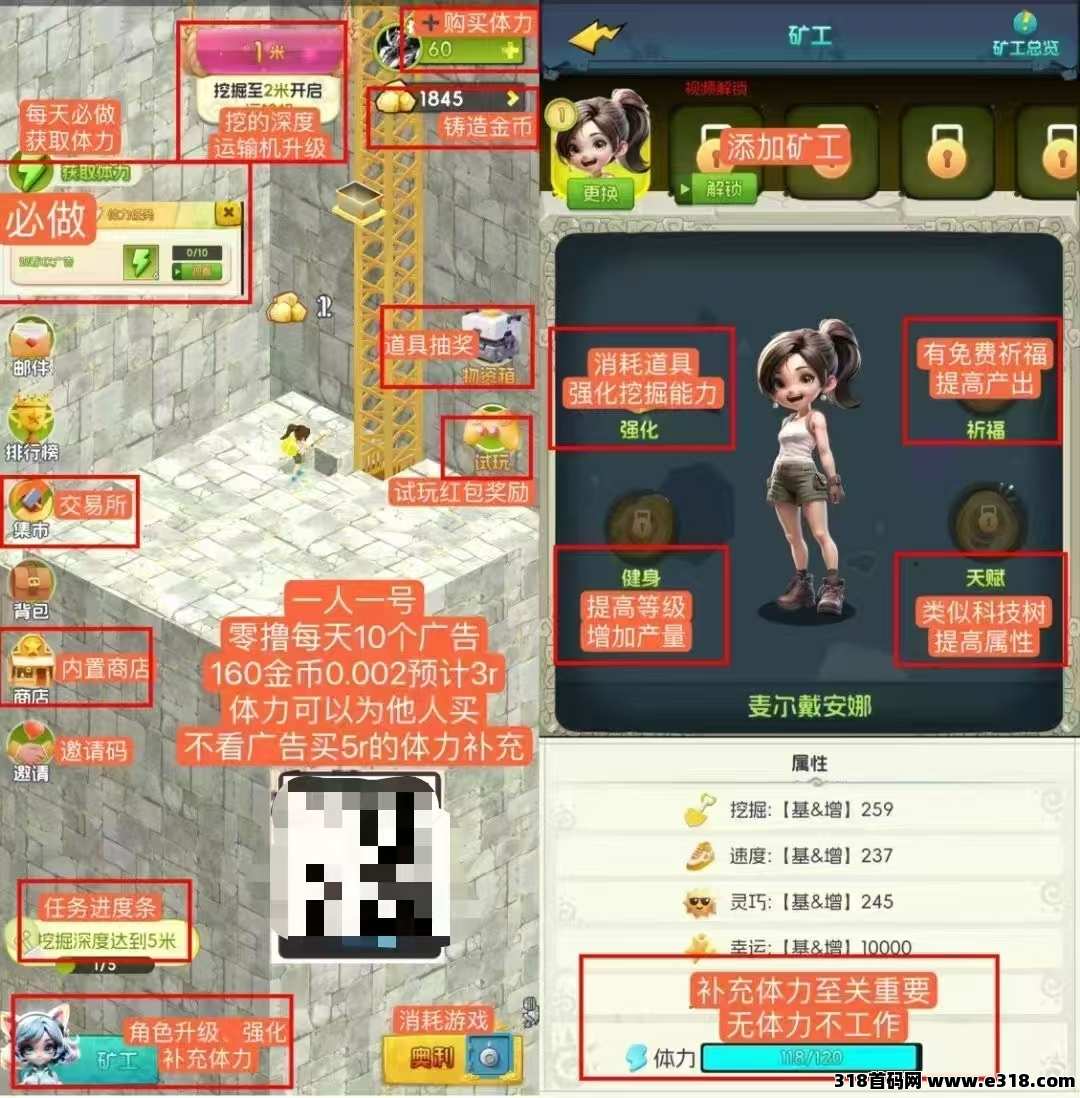 矿工小能手,每天10个广告,全部做完每天160金币( 金币价格0.02- -个)每天润3.2米