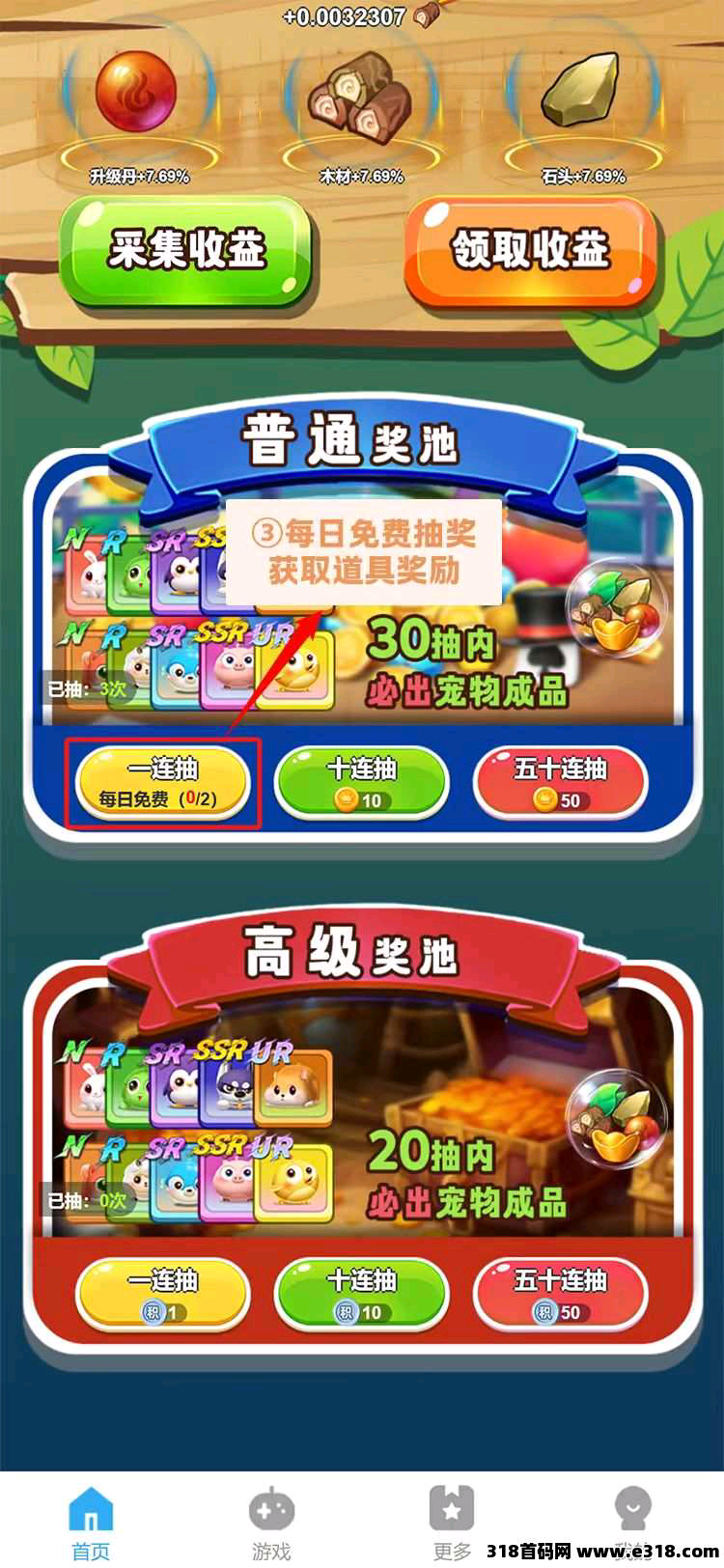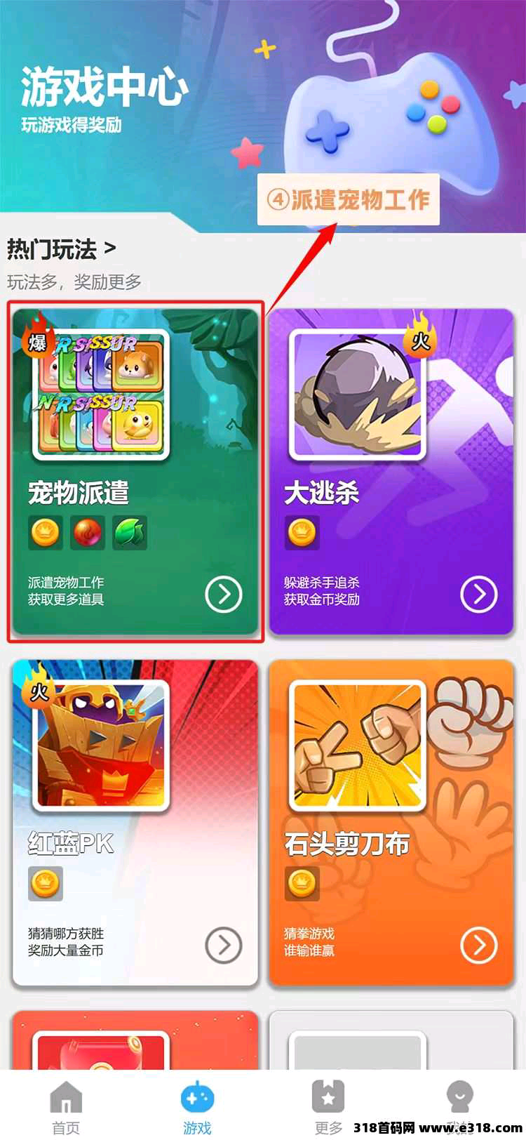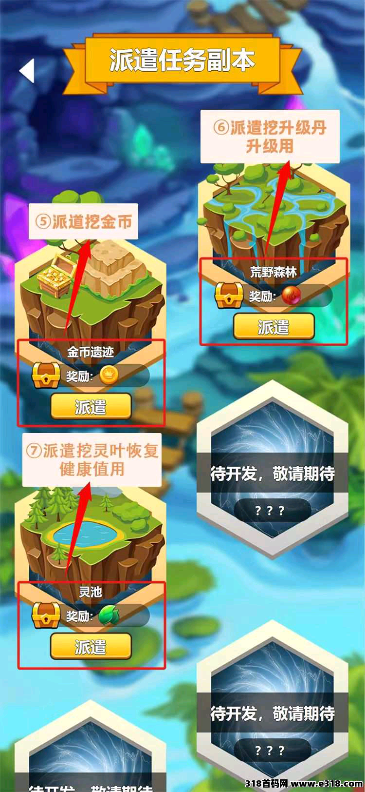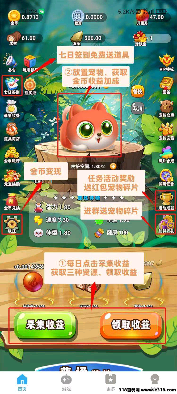 派遣宠物获取金币以及获取宠物升级所需升级丹、恢复健康的灵叶等道具。
