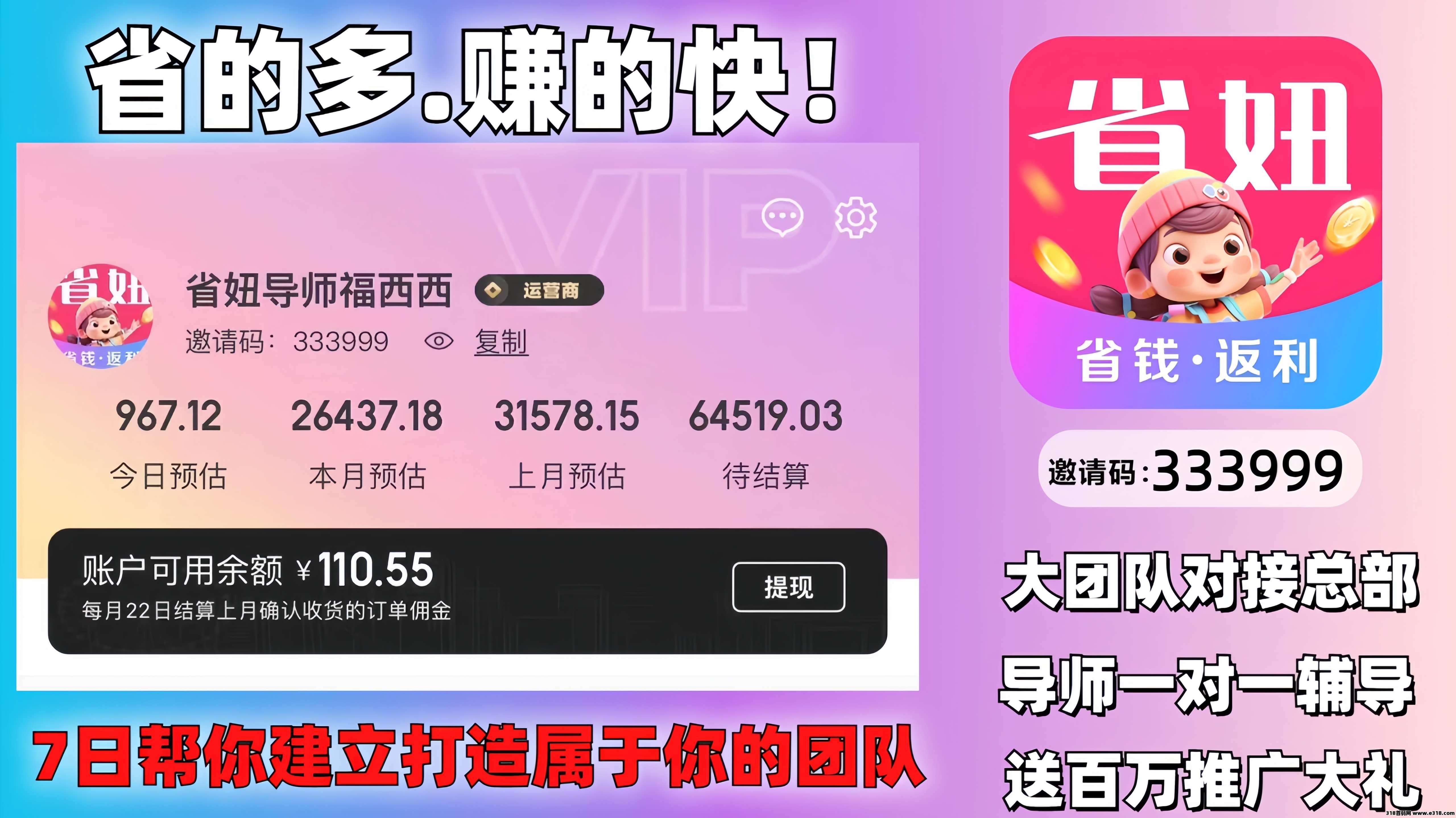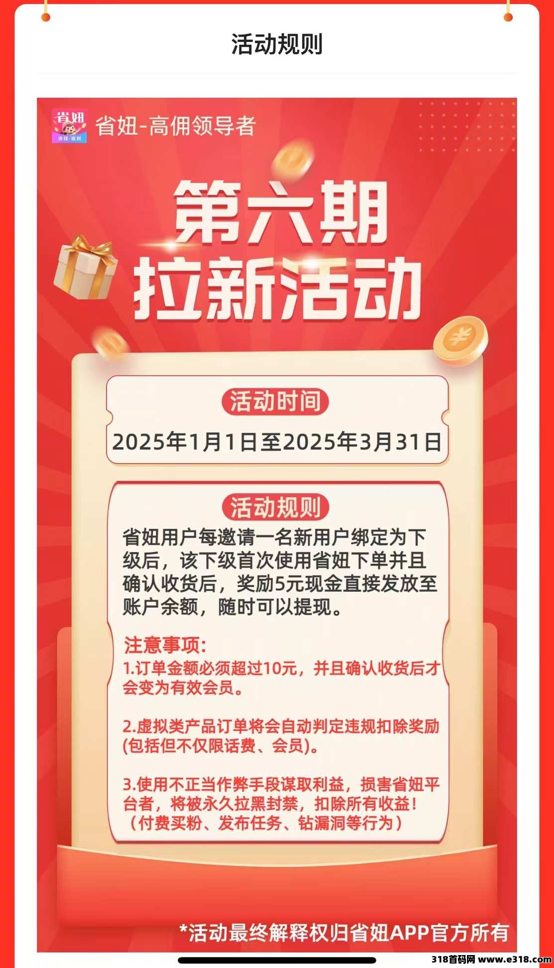 省妞长期会开放新人0元购,以及拉新5元奖励,这是大多数平台没有的,平台拥有强大的现金流支撑补贴推广人员,保障了推广人员的基本收益回报。