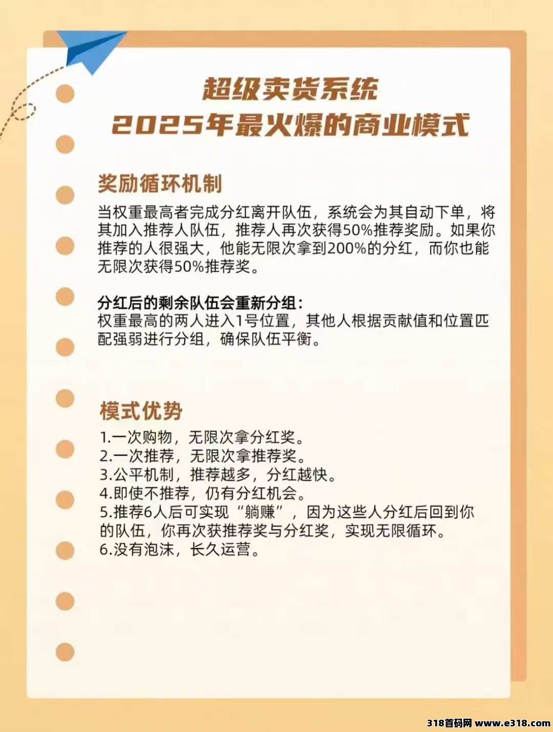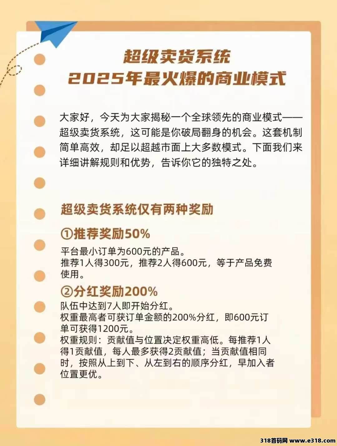 全行业领先的卖货系统,只需买600产品就能自动参与组队,直推300,7人组团自动出局得1200,循环组队循环出局拿**,日赚2400元以上。