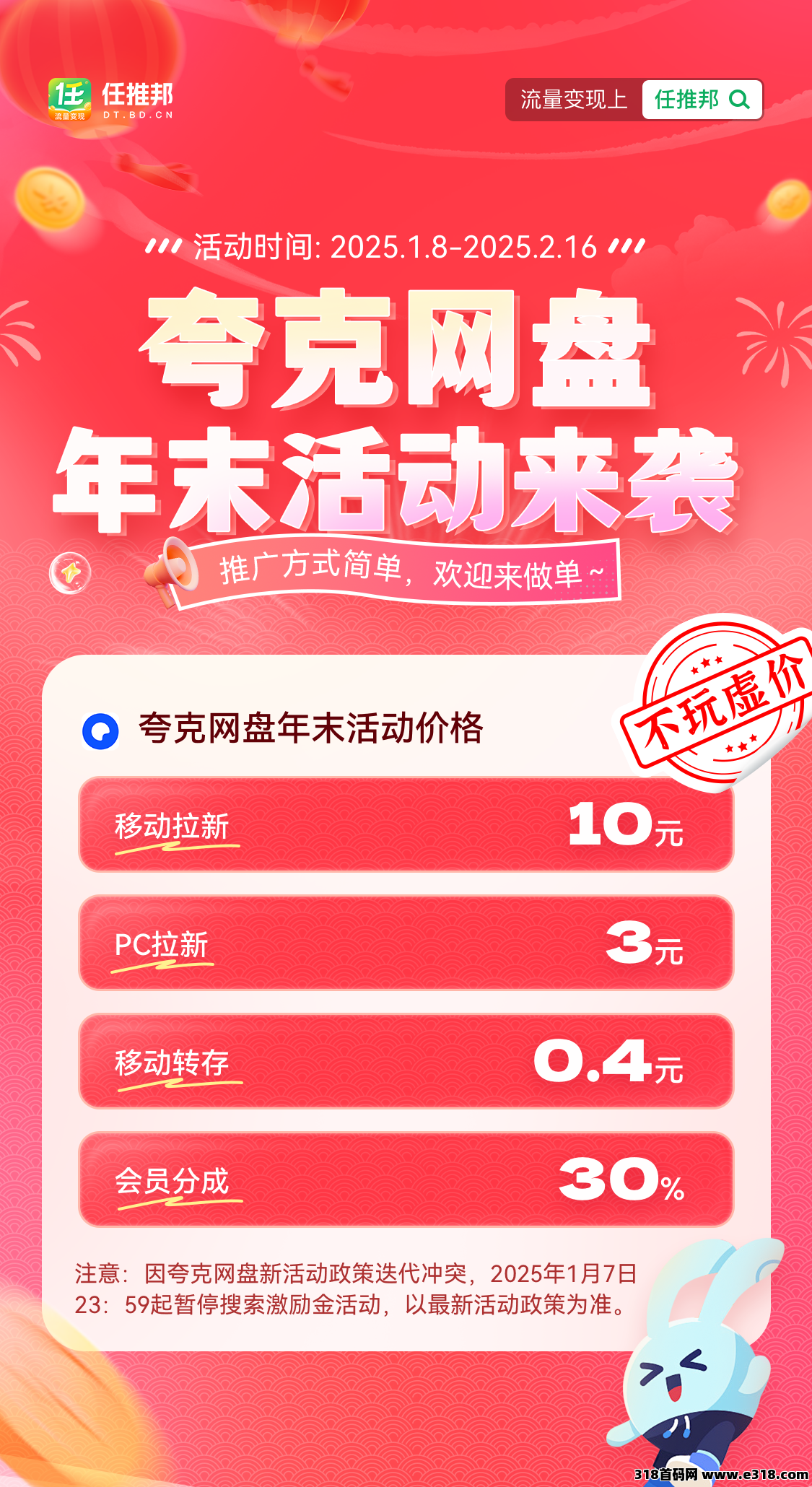 为什么推荐任推邦平台呢?那是因为任推邦是国内知名项目拉新平台,是夸克、字节、迅雷、京东快手等公司的核心服务商,承接的项目大多是官方直签,已经累计发佣超过2亿。在该平台可以申请夸克网盘、迅雷网盘等多种网盘的拉新项目。