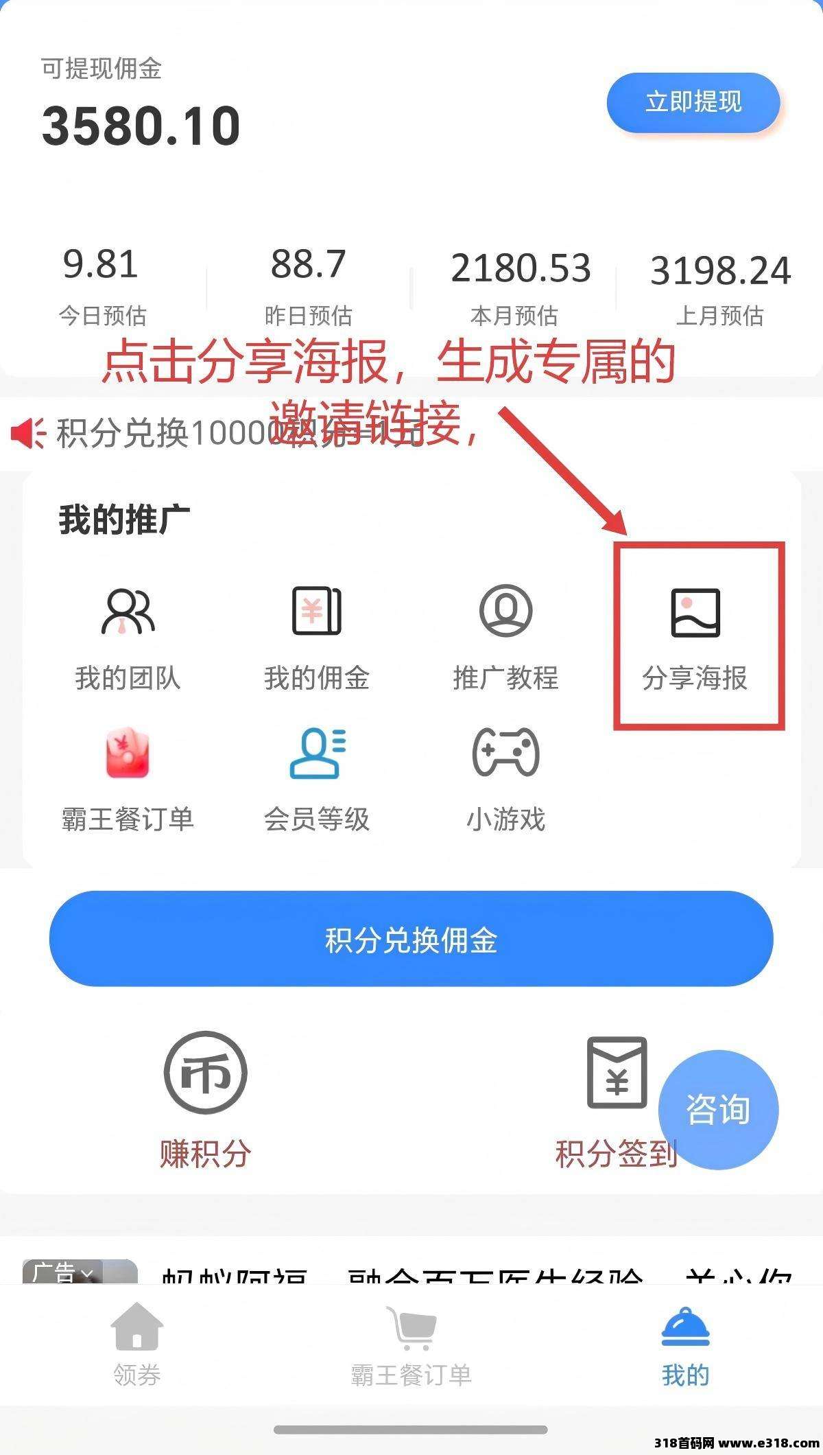 如果你今天是一个外卖推广者,你把外卖帮的小程序分享给你的好朋友小明,小明通过你的分享去外卖帮领券下单,那么你就可以获得返佣,《小明能省钱,你也能赚钱》,你推广的小明越多,你赚的也就越多