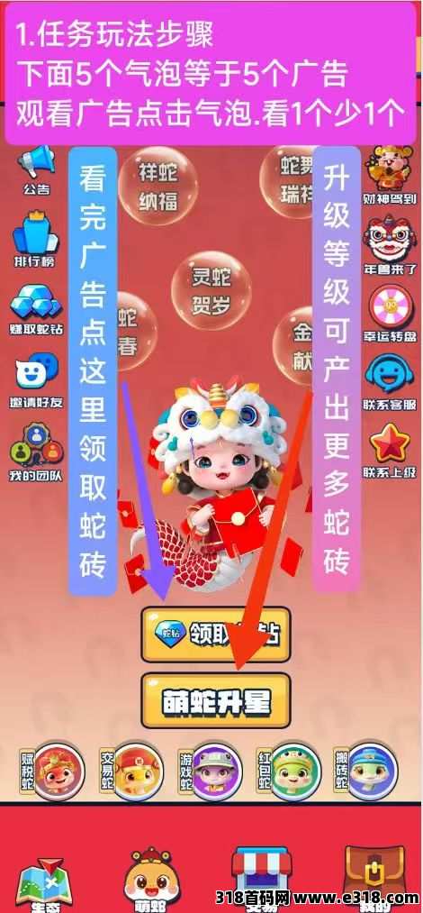 1.免费零撸,每天点气泡看5个广告,产一个蛇钻,外场无限回收