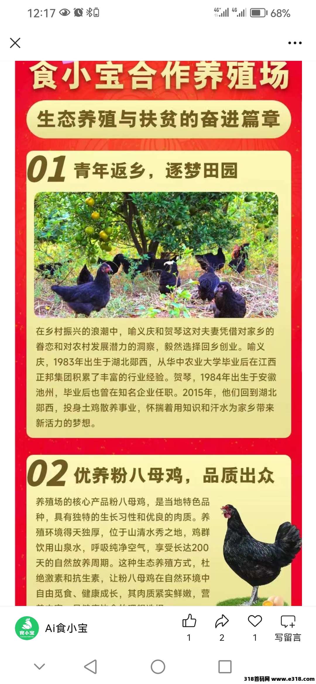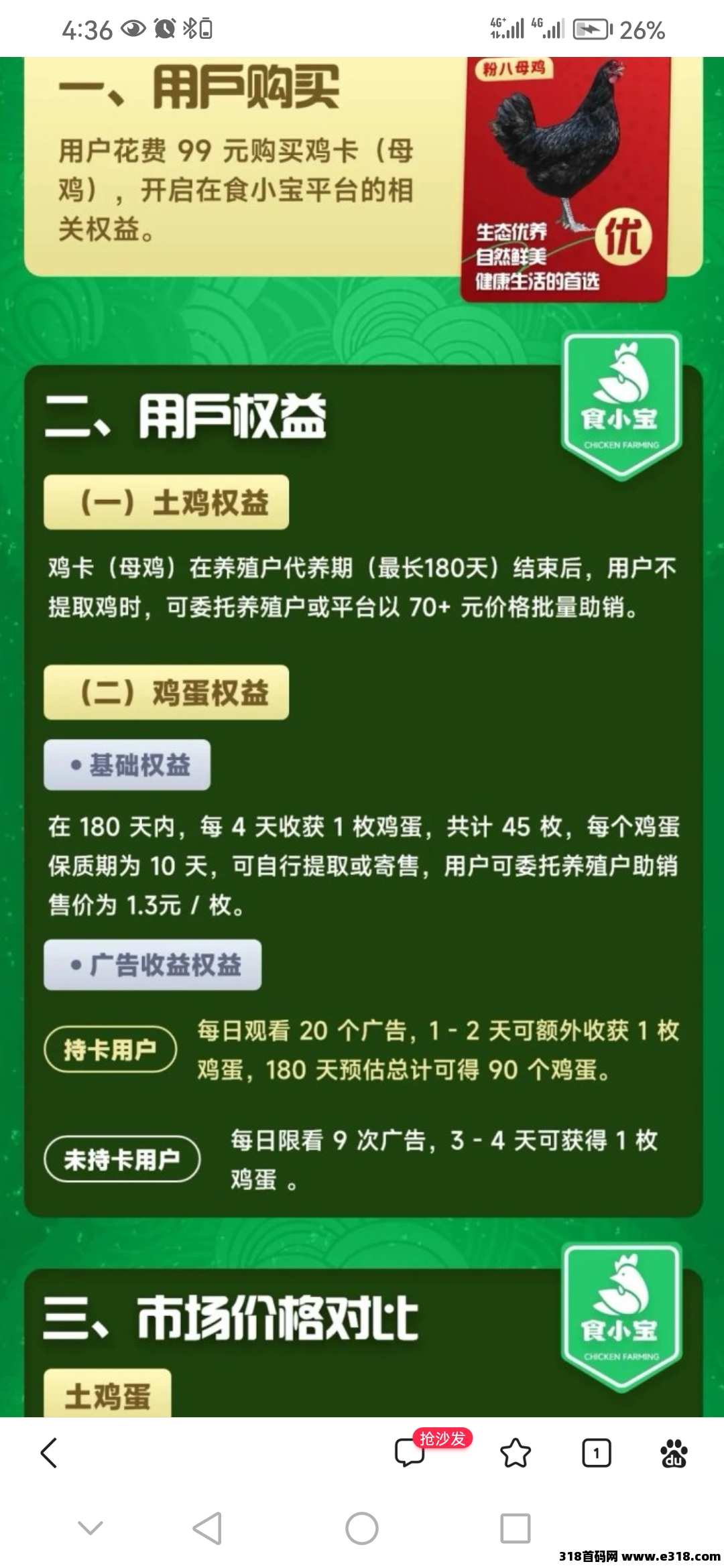 今日首码【小宝养鸡】赚钱项目刚刚上线,通过99圆兑换“鸡咔”,获得一只母鸡。母鸡每4天产出1枚鸡蛋,鸡蛋可寄售卖给用户,价格可以自己设置一般1.3-2元/每个!每个鸡蛋期限十天如果到期没用户买养殖场自动回收变现。另外鸡蛋不卖也可邮寄到家!母鸡的期限是181天,到期鸡也可以卖掉,或邮寄到家尝鲜,提供了多种收益选择性。每个人可以买一百只鸡。意思是鸡卡可多数购买,有实力的可以多养,回报可观。推广暴利,每个下级开了鸡卡你得八个鸡蛋,间推两个,而且团队达到一定开卡数还有额外鸡蛋奖励都可以卖!下图有经销商推广奖励介绍!