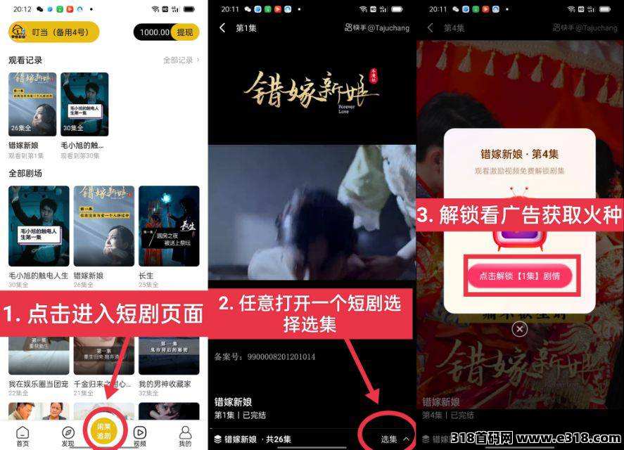 每个短剧到第三集,到第四集解锁就要看广告。一个广告30秒200火聪