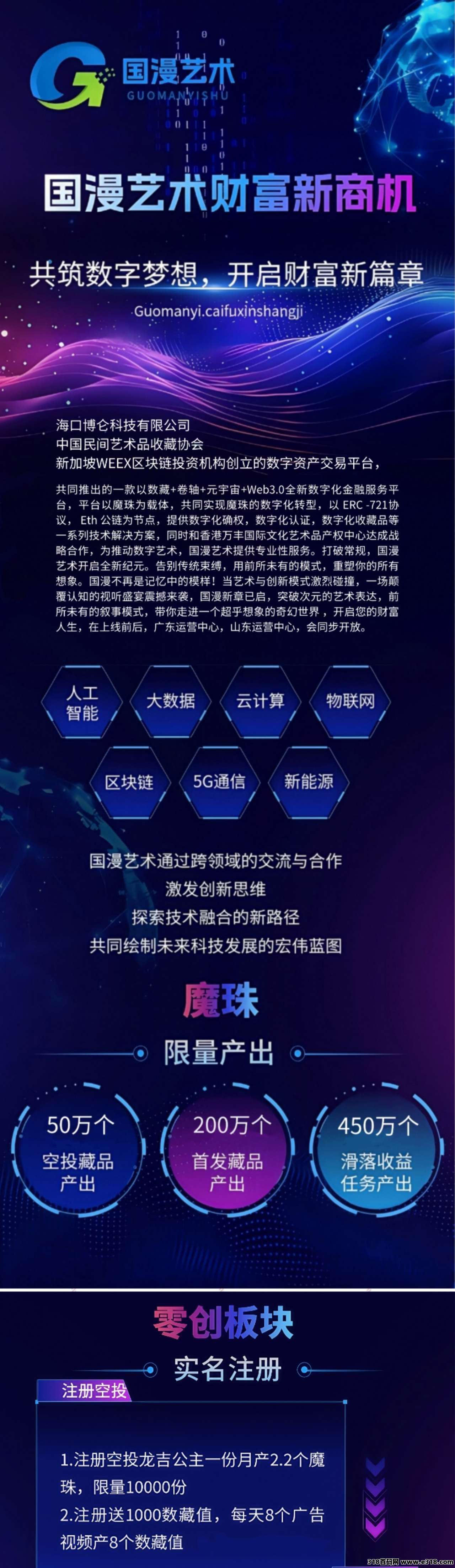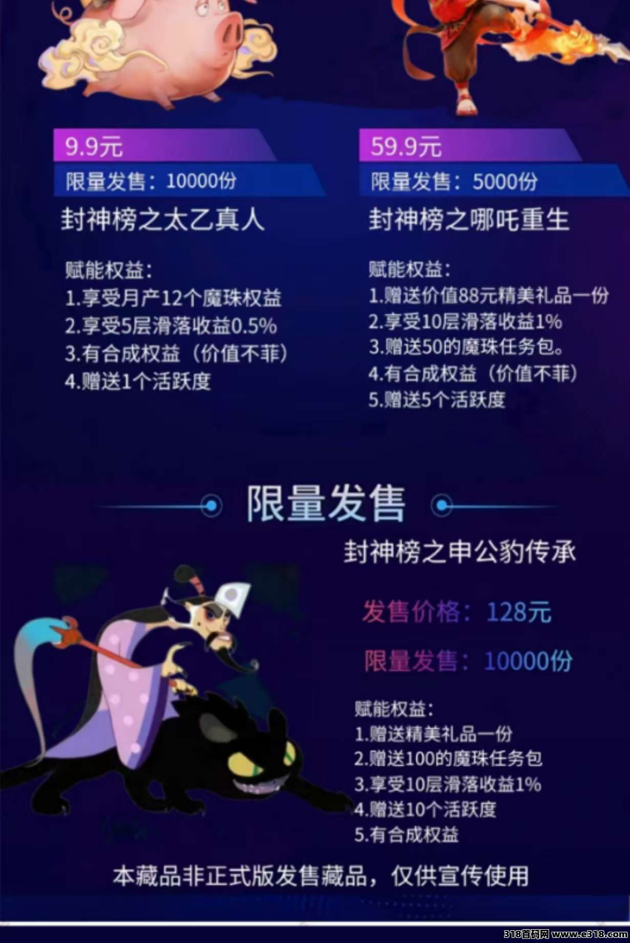 NFT+卷轴+元宇宙模式,全网一条线公排滑落,不推广照样滑落团队,享10层滑落团队收益,早注册早占位,免费注册空投得龙吉公主,0撸每日活动中心签到月产2.2个魔珠,首发9.9太乙真人月产12魔珠,59.9哪吒月产62魔珠,128申公豹月产120魔珠,加速释放,上星永享全网分h。
