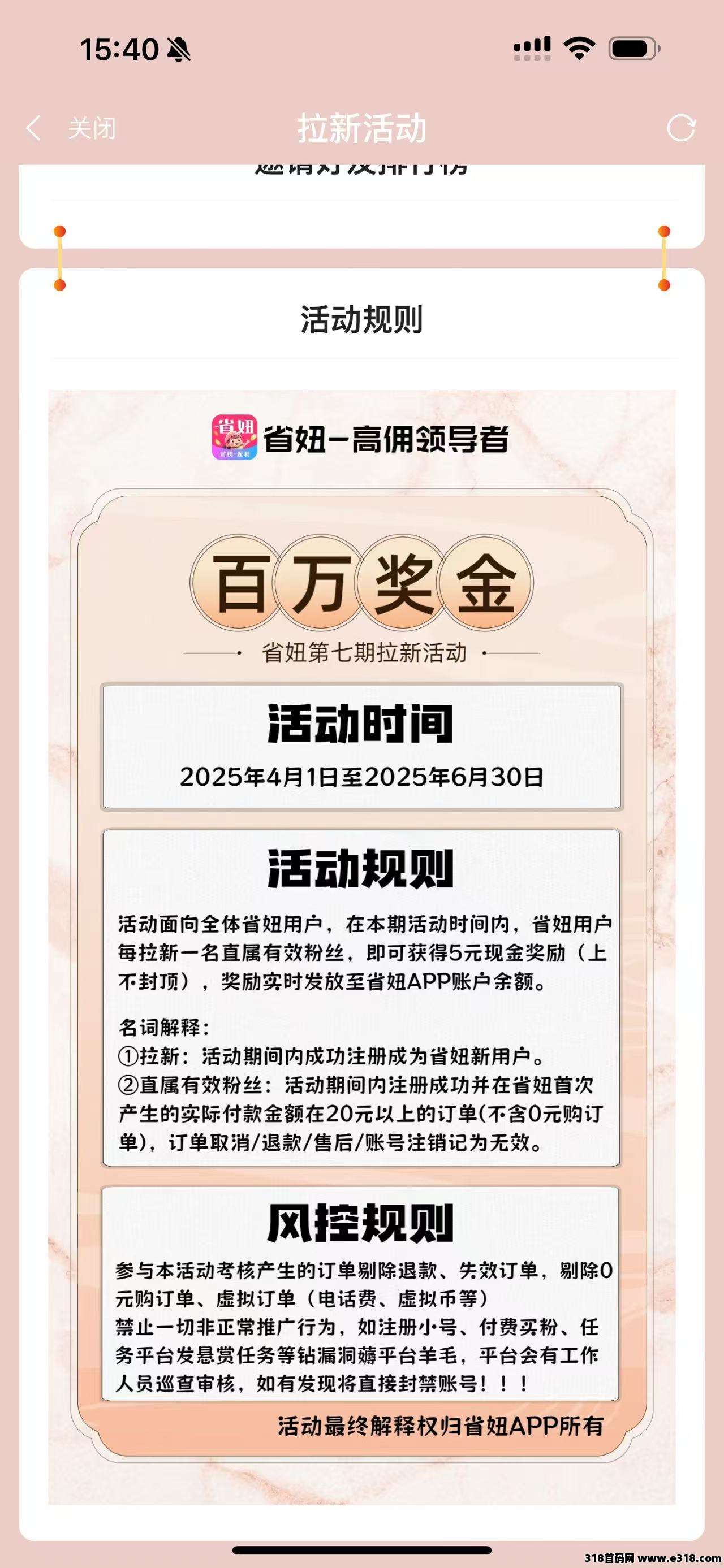 省妞 APP 深知用户口碑传播的重要性,为此特别设立了极具吸引力的拉新奖励机制。当老用户成功邀请新用户加入省妞 APP 并完成指定任务后,老用户将获得 5 元现金奖励,且该奖励可直接通过支付宝提现,方便快捷。对于新用户而言,填写省妞 APP 官方 + 联合最大创始人天意导师官方邀请码 777766 注册,可享受诸多额外优惠和福利。其中最具吸引力的便是直接直升团长。团长身份赋予用户更高的返利比例,同时还能从团队成员的购物返利中获取一定比例的提成奖励。这一拉新奖励政策不仅让老用户在分享平台的过程中获得了实实在在的经济收益,也让新用户在加入之初便享受到了更多的特权和优惠,实现了双方的互利共赢。通过这种双赢模式,省妞 APP 的用户群体得以迅速扩大,形成了一个充满活力和粘性的购物社区,大家在分享购物经验和省钱技巧的同时,共同享受省妞 APP 带来的优惠红利。
