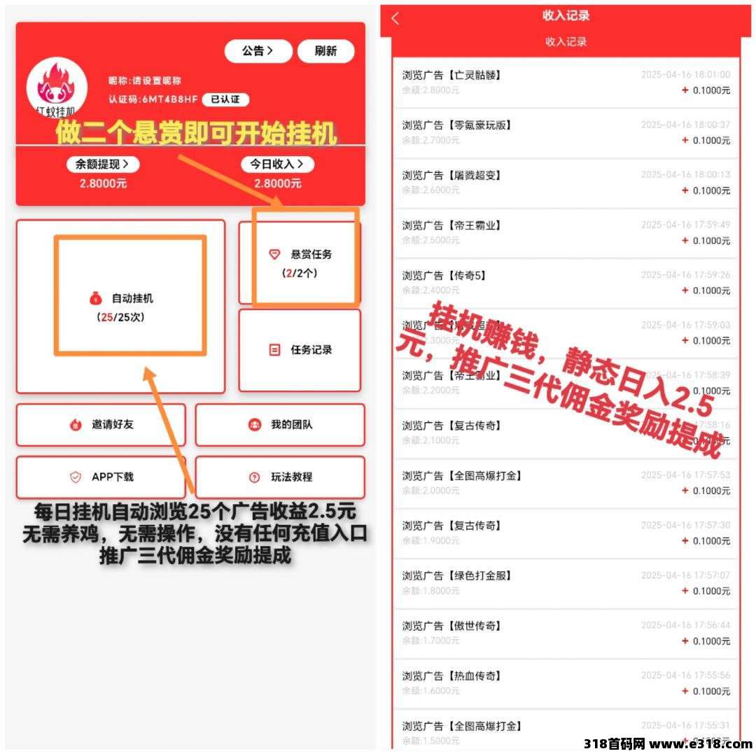 首码,红蚁挂机,**日入2.5元,纯零撸,没有任何充值