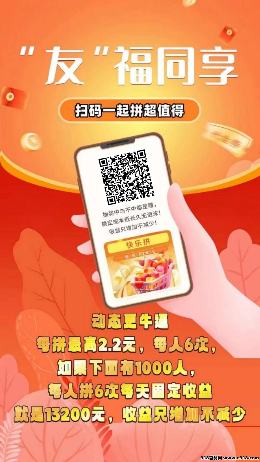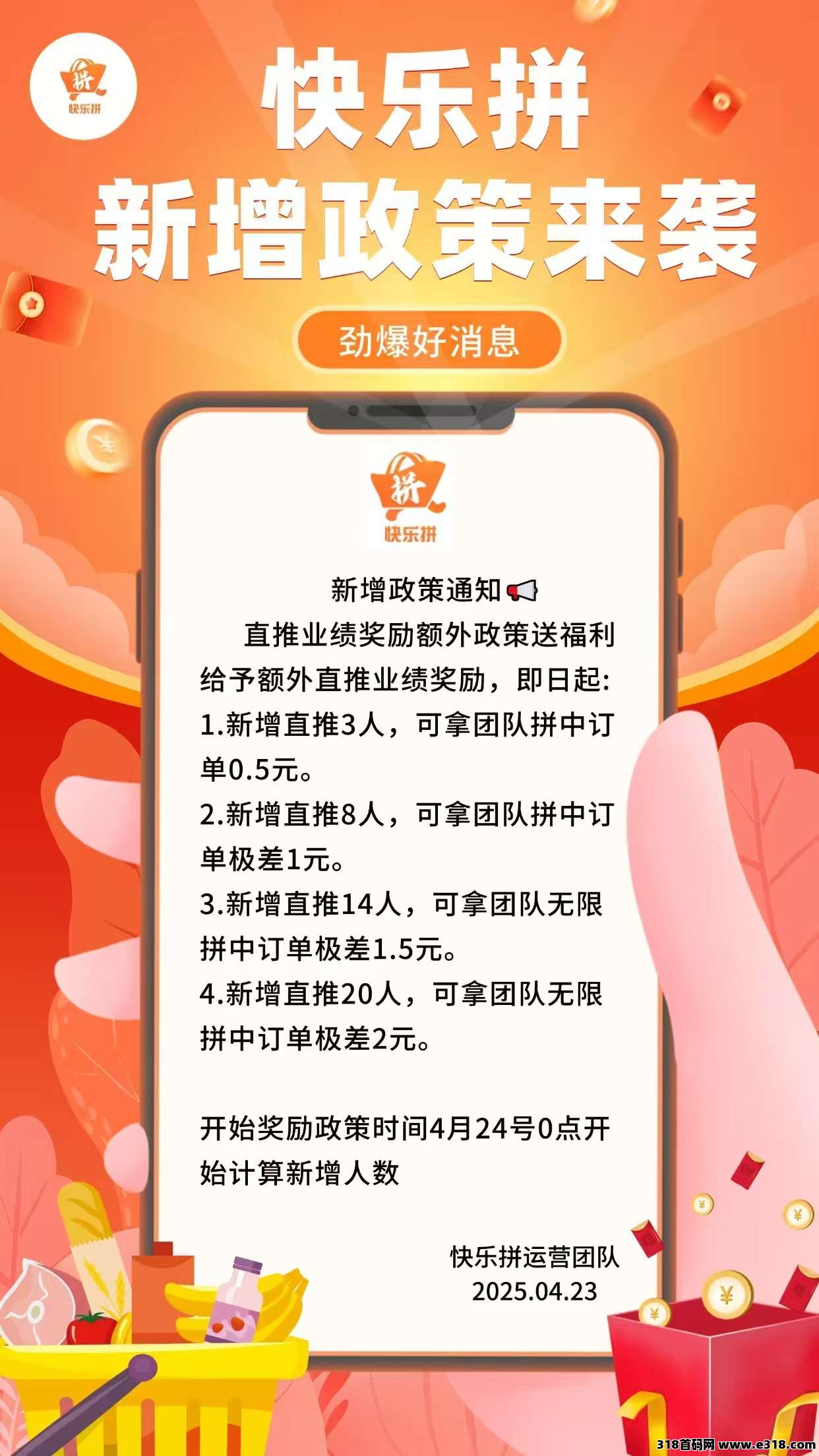 快乐拼是由【深圳星火未来商贸有限公司】推出的全新拼团玩法,4月12号己正式上线,速度上车,坐等收米!