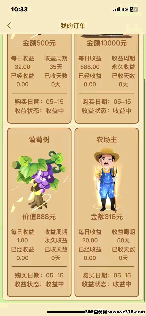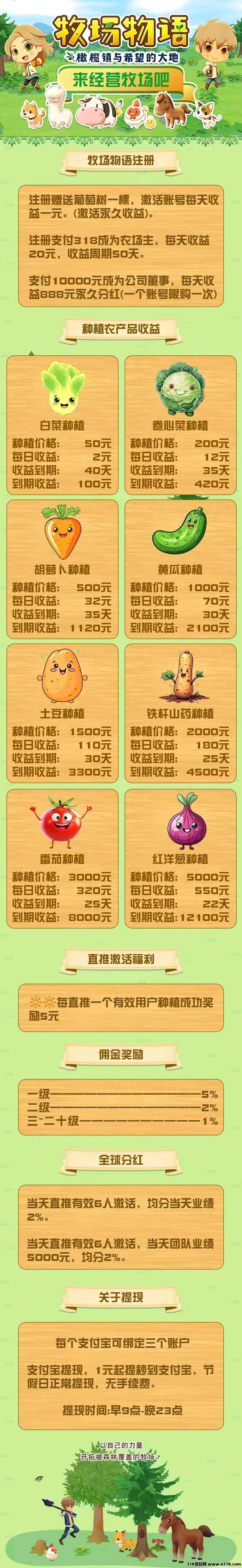 牧场情怀,奖励588(葡萄树价值)预热新项目牧场物语,最低下单50激活每天3,1起提,零投资直推一人奖励7.5,无上线零撸首码