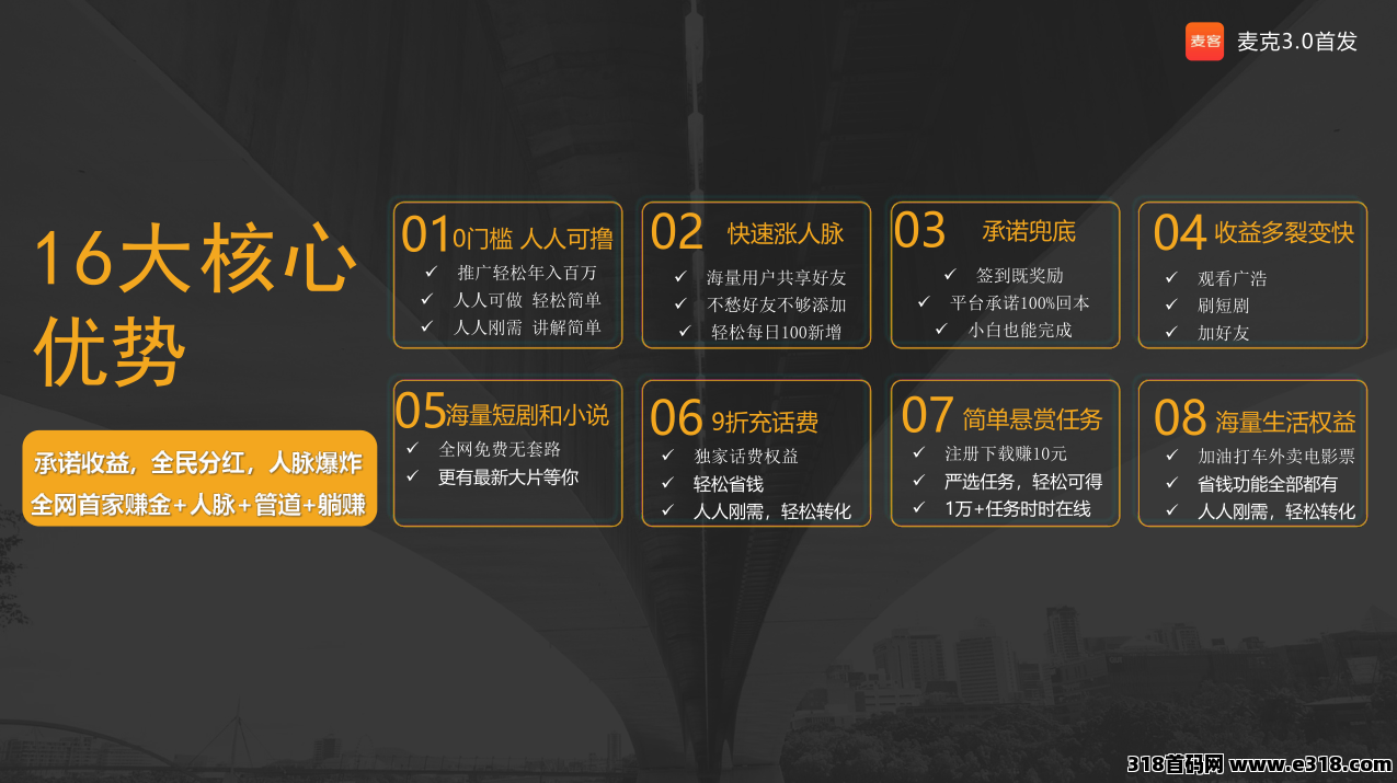 麦客3.0还拥有16大核心优势,保证让会员每天获得稳定收益的同时,还能助力团队长快速做大做强,更多玩法,联系我获取详细介绍。
