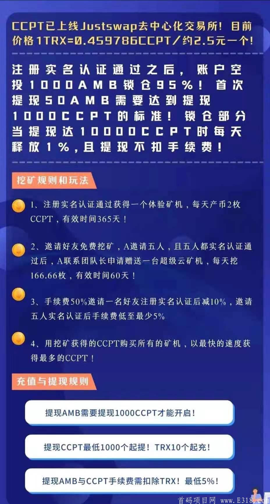 充值与提现规则:提现AMB需要提现1000CCPT才能开启,提现CCPT最低1000个起提,TRX10个起充!