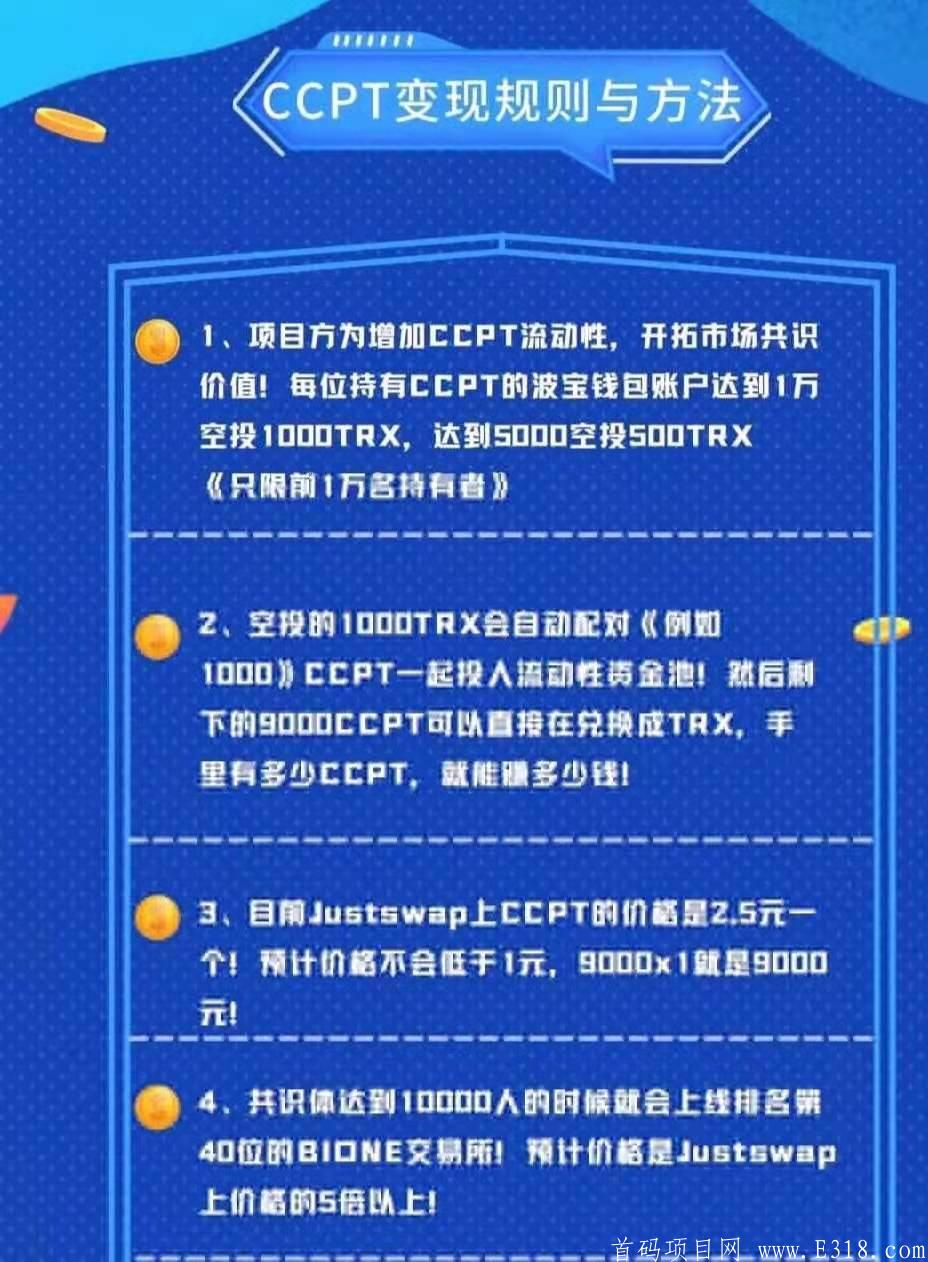 目前Justswap上CCPT的价格是2.5元一个!预计价格不会低于1元,9000×1就是9000元!共识体达到10000人的时候就会上线排名第40位的BIONE交*所!预计价格是Justswap上价格的5倍以上!