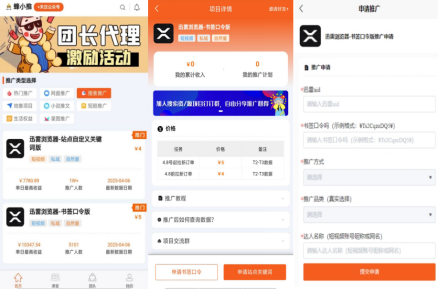 目前迅雷浏览器的推广主要通过第三方平台进行,例如蜂小推平台。你需要通过蜂小推公众号下载app并注册账号,在首页搜索“迅雷浏览器”项目并申请加入,审核通过后获取专属推广口令;开始分享推广内容,吸引用户点击安装。