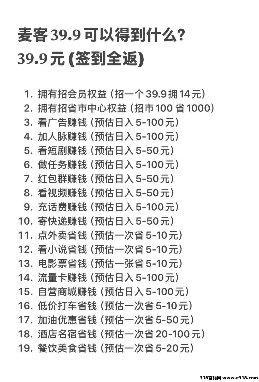 麦客APP提供多种赚钱方式,人人都可以参与,可以零撸,开通会员收益会更高,门槛只需39.9,签到全返。