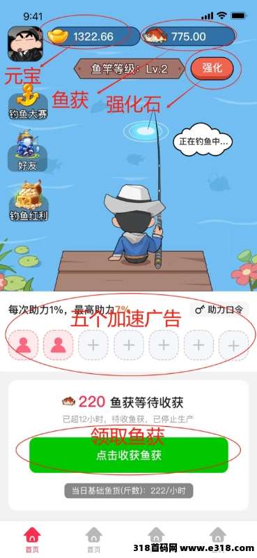 3、鱼获团队奖励:鱼获直接提米,鱼竿等级越高产值越高,例如说一级鱼竿是一天产出220鱼获,那十级的鱼竿就可以产出2220鱼获,鱼获的话是12小时领取一次各位小伙伴不要忘记了!