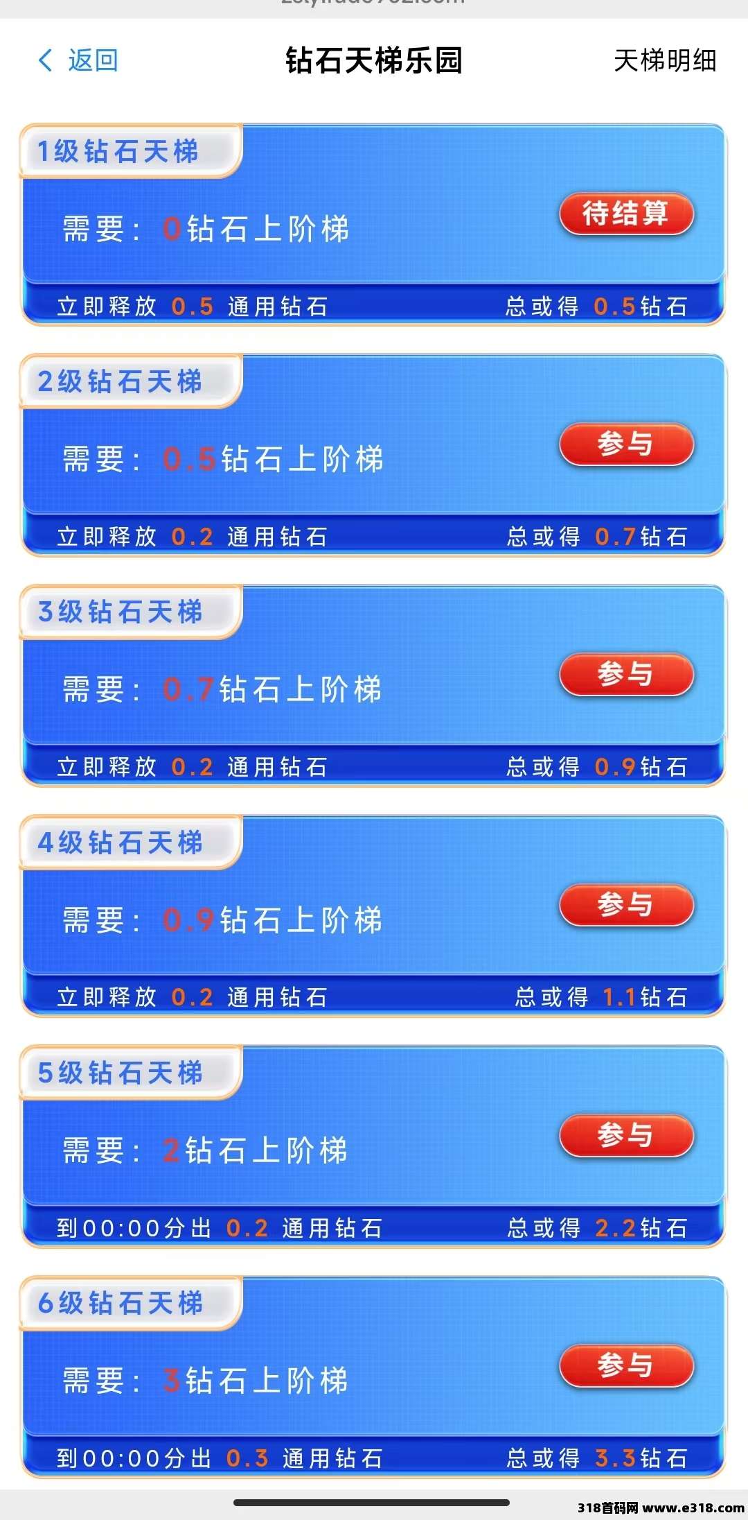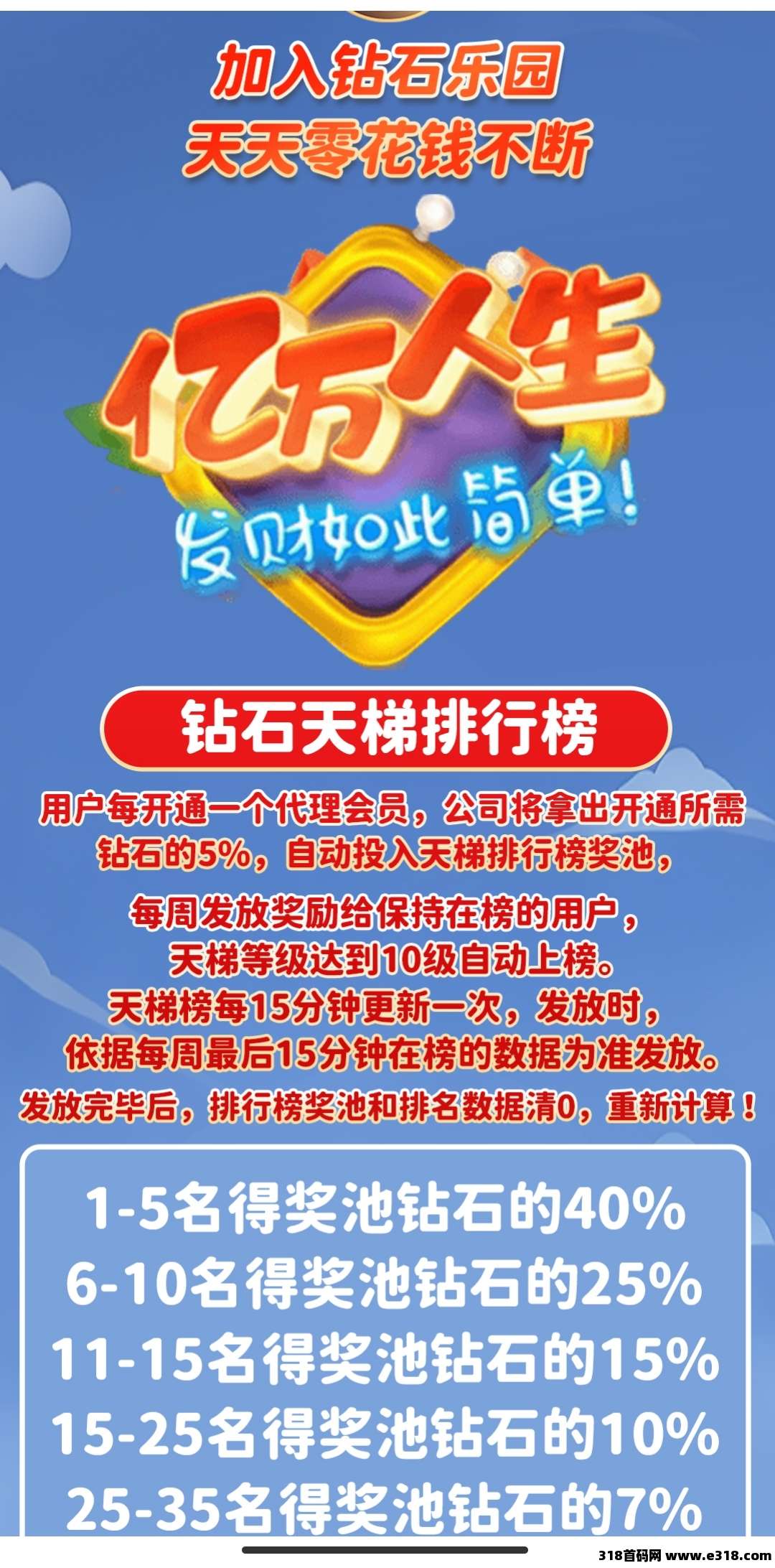 钻石天梯奖励三代:下级参与钻石天梯,1代得20%,2代10%,3代5%。