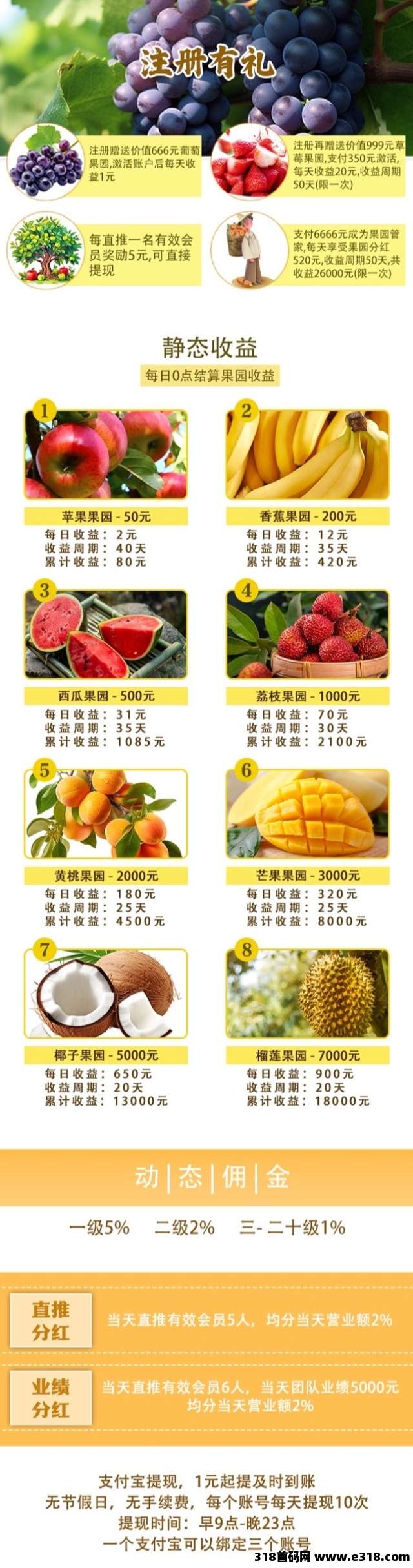 首码上车【创享果园】注册送666元葡萄果园每天自动收益,再送999元草莓果园每天收益20元,成为果园管家每天**520元,1元起提秒到