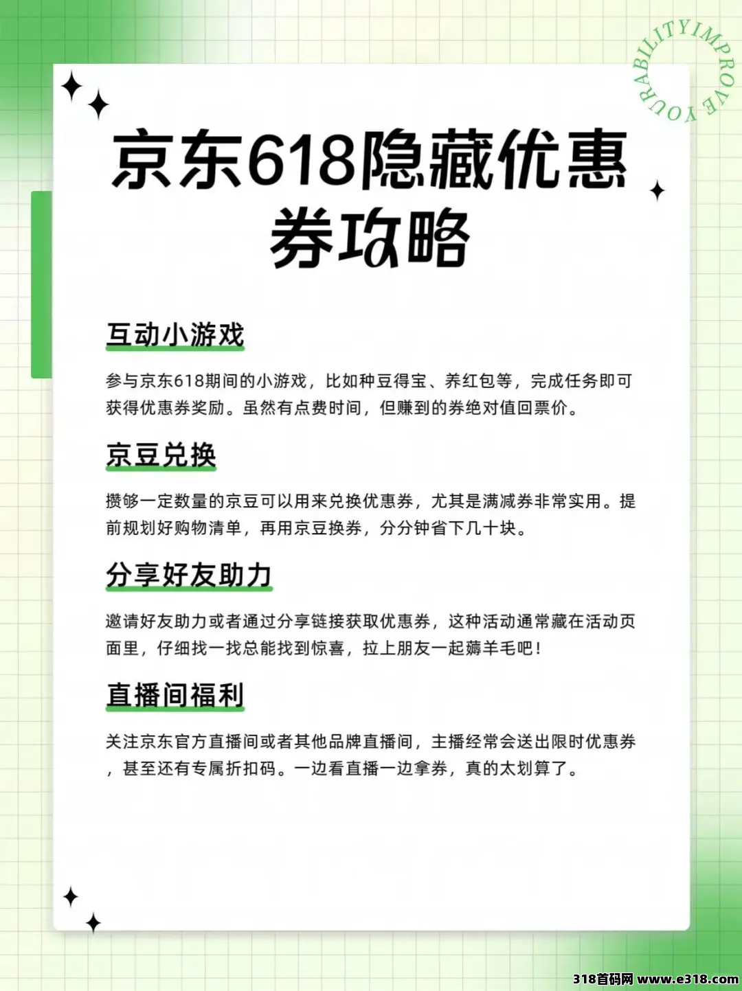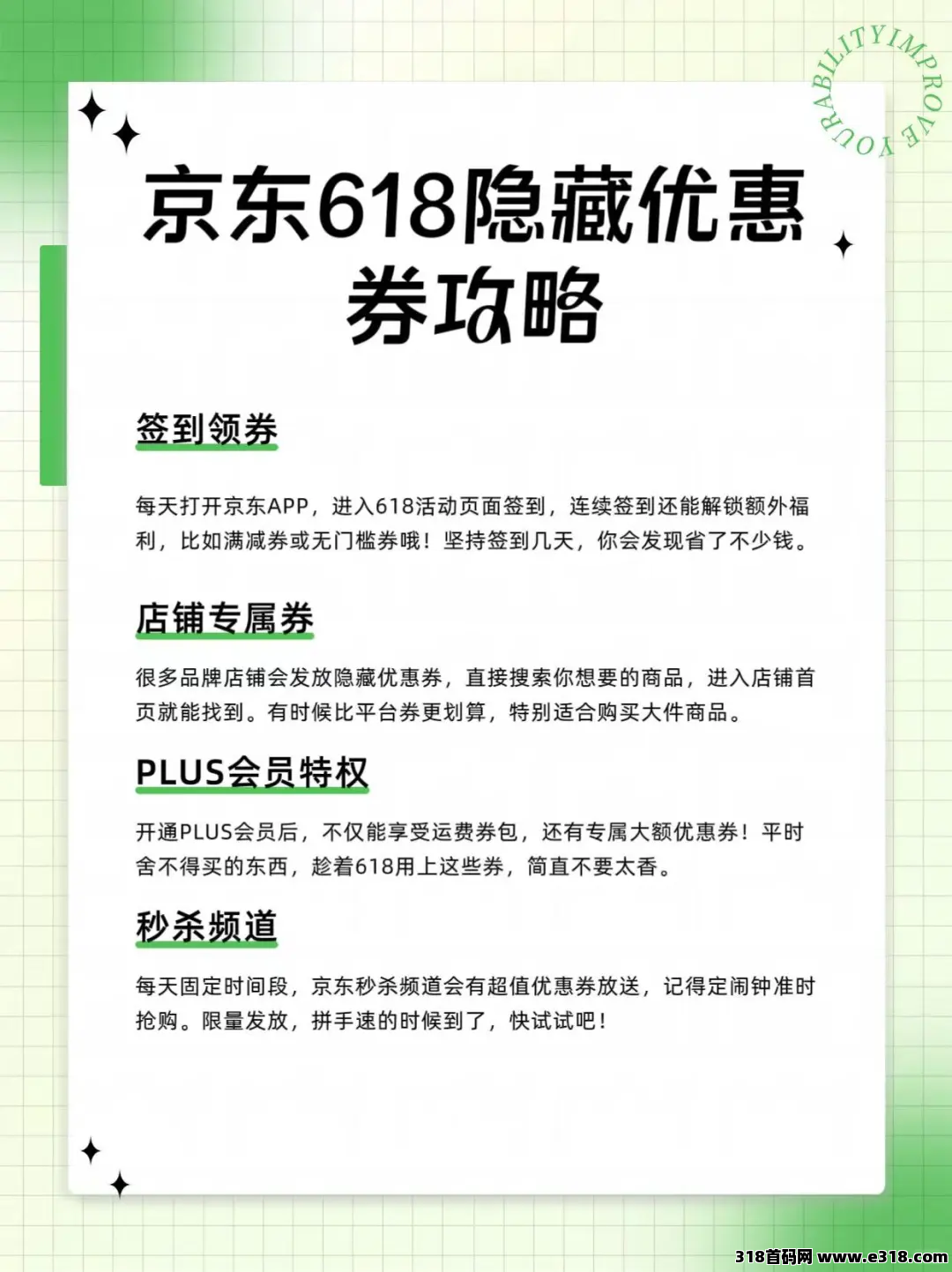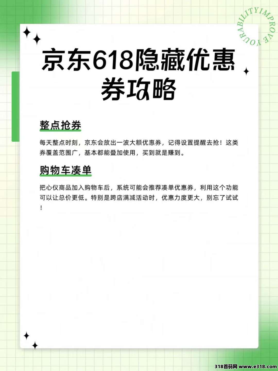 1.关注京东主会场:618活动期间,首页顶部「京东618」主会场内常隐藏限量优惠券