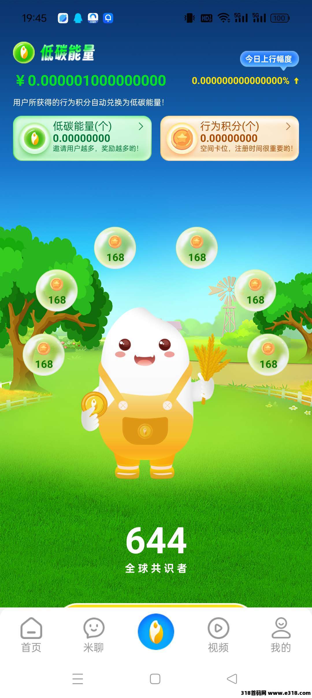 夹米零撸,一个圈圈模式,每日看6广告保底得活跃积分,活跃积分自动转为绿色能量,启动后产绿色能量,每日释放的绿色能量可兑换提米。