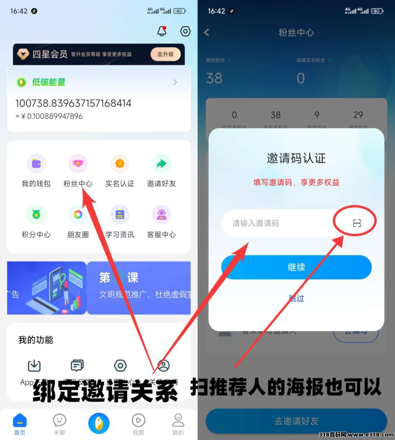 一定要绑定邀请关系,否则无团队分洪,看视频广告无收益。