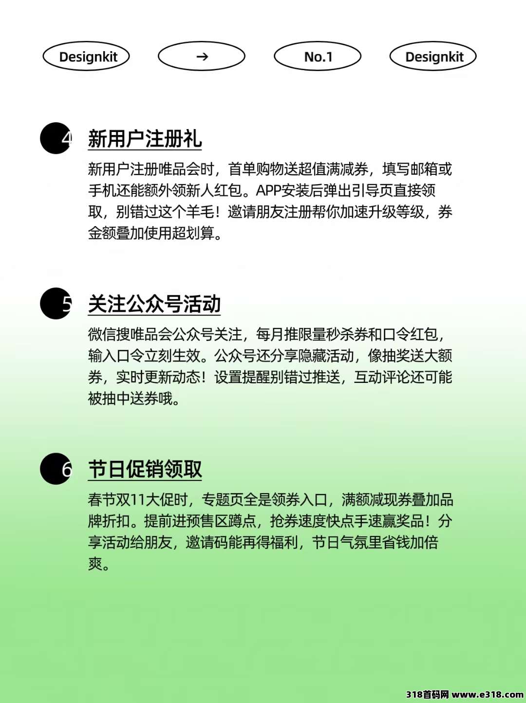 3.订阅唯品会微信公众号或服务号,定期推送专属优惠券和限时活动,部分券仅限粉丝领取。