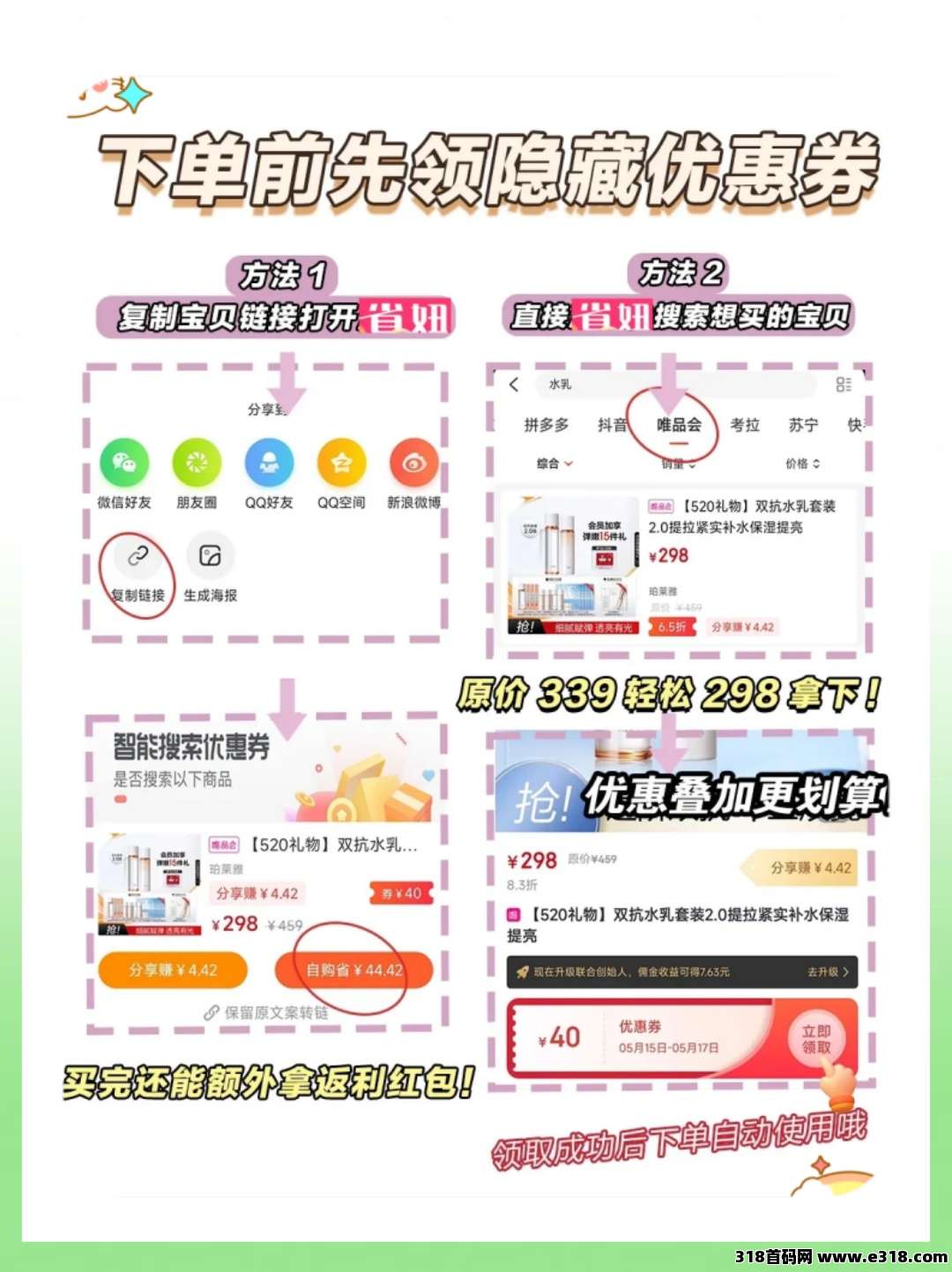 4.省钱的好方法就是使用省妞这个网上购物返利app。对于熟悉网购的人来说,淘宝、天猫、京东、拼多多、抖音、快手、唯品会商城都不陌生。通常情况下,我们会在这些商城直接下单支付购买商品。但现在,听我说,不要急着下单,而是复制或拷贝商品标题,在省妞app中进行搜索。