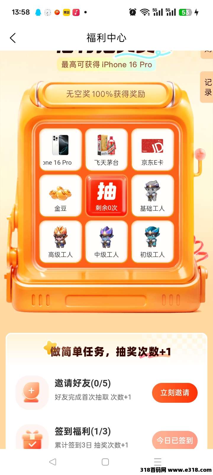 ①首页通过福利中心免费抽取,系统初始会赠送1次机会,签到满3天,会额外获得1次机会,每邀请一名好友抽取,可获得1次机会,每人最多可以抽取5次,最低获得2名基础工人,更有IPhone 16 Pro )奖励等你拿!