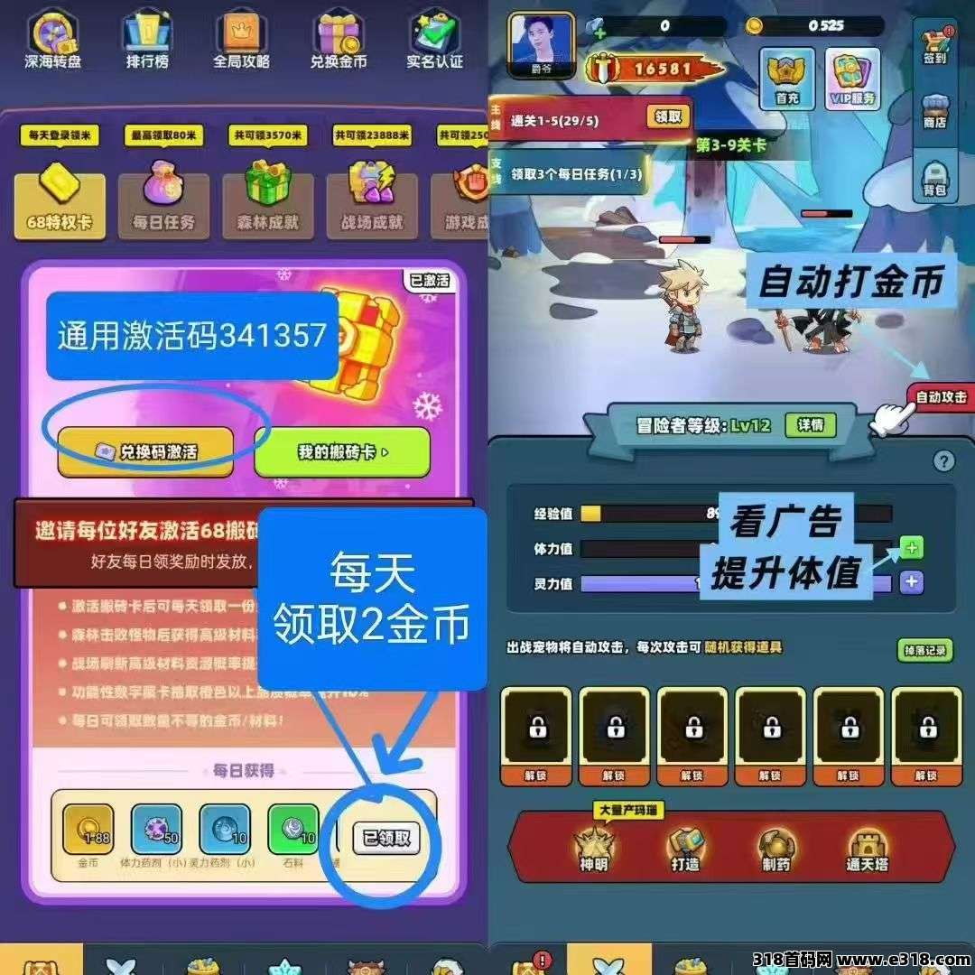 每天可以点一下开宝箱领取2~88个金币,可以不看广告,每日零撸3米左右,免费送价值68的搬砖卡,1金币=1米,实名+激活搬砖卡结算!还有战场玩法