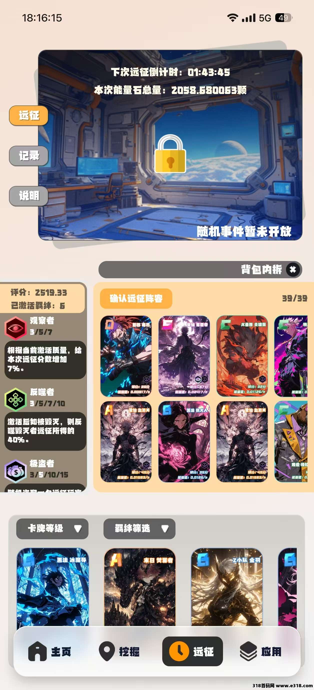 这里是远征玩法页面,可以看到创新的卡牌羁绊玩法,不是纯抄盘: