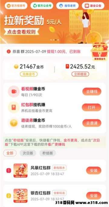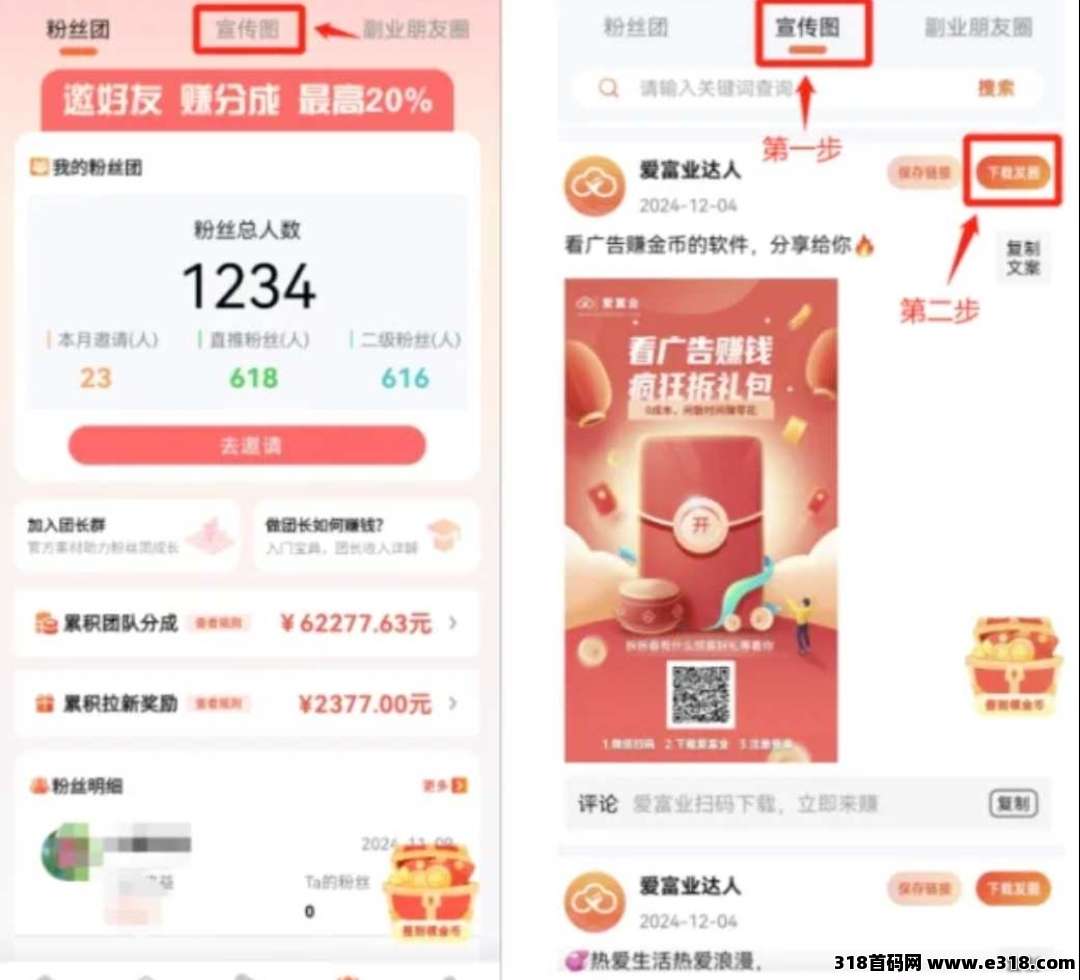 粉丝赚钱,团长躺赚,邀请新人在平台看广告赚钱,你即可免费开通团长后台,获得ta收入的分成;团长享所有粉丝收入15%-20%的分成;