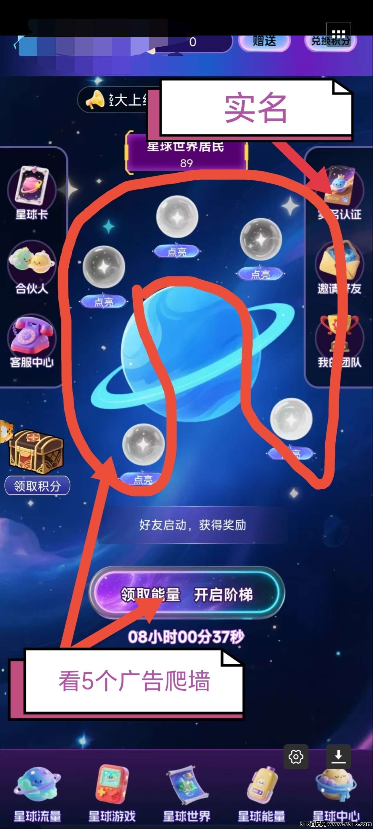 实名认证后,点亮5个小球,看5个广告,领取后上墙。