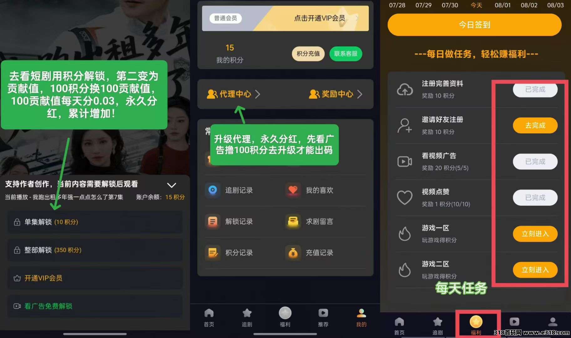可投可零撸,零撸每天150积分+游戏试玩获取大量积分,积分用途:解锁短剧次日释放贡献值每天领取分虹!