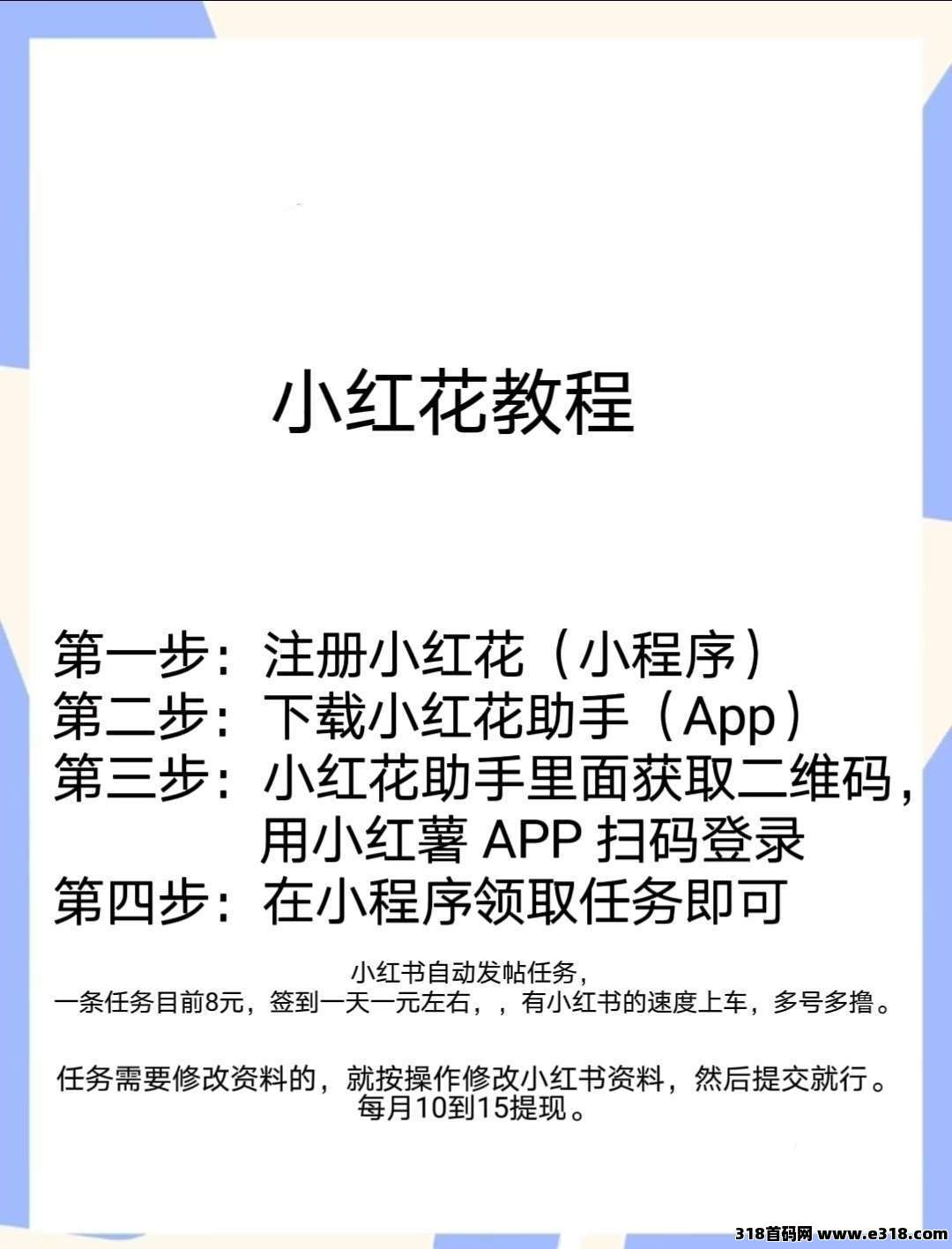 小红花首码,书托管自动发贴,零撸保底收益高,一条8块,第一次要自动领取帖子,设置一下资料,后面就可以自动托管不用管了,注册了里面的教程看一下