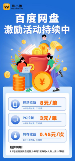 注册与申请:首先,微信搜索并关注“蜂小推”公众号,下载并注册蜂小推APP(填写邀请码000000,开启专属福利)。在APP内申请开通百度网盘拉新权限,等待审核通过。审核通过后,你将获得一个专属的推广链接。
